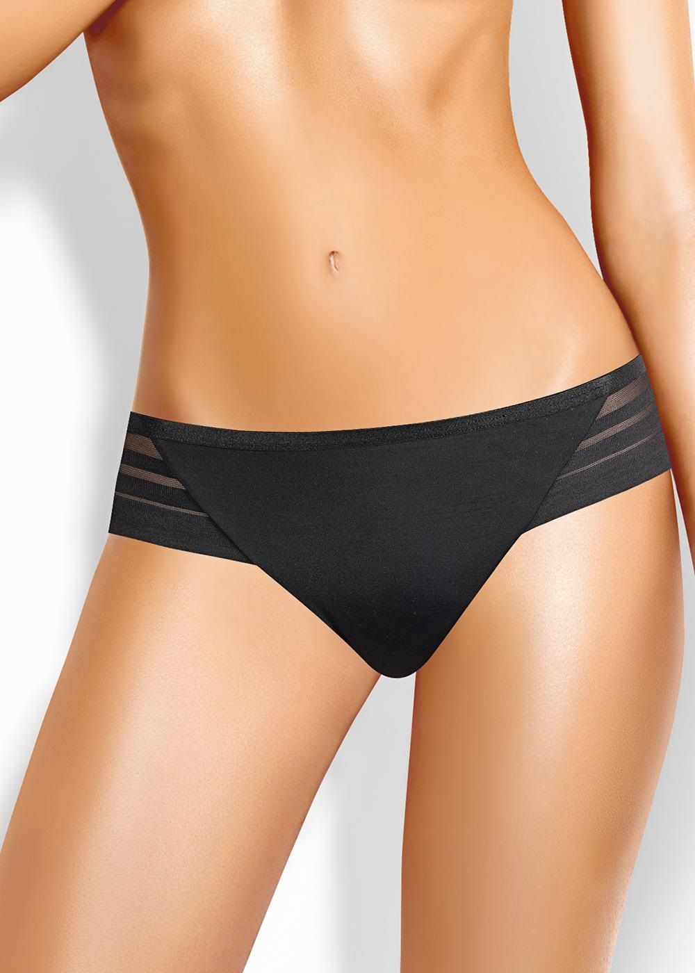 трусы бразилиана на средней посадке из гладкого полиамида и вставками из сетчатого полотна, необработанный край не распускается и незаметен под одеждой