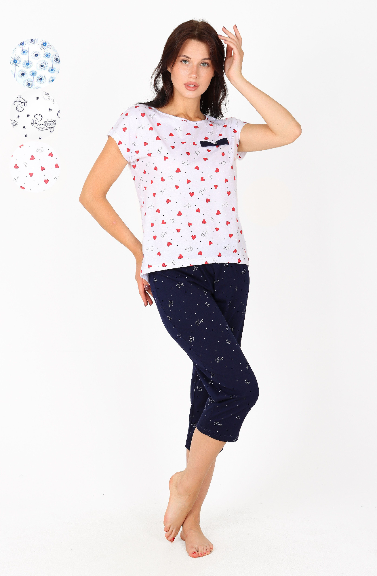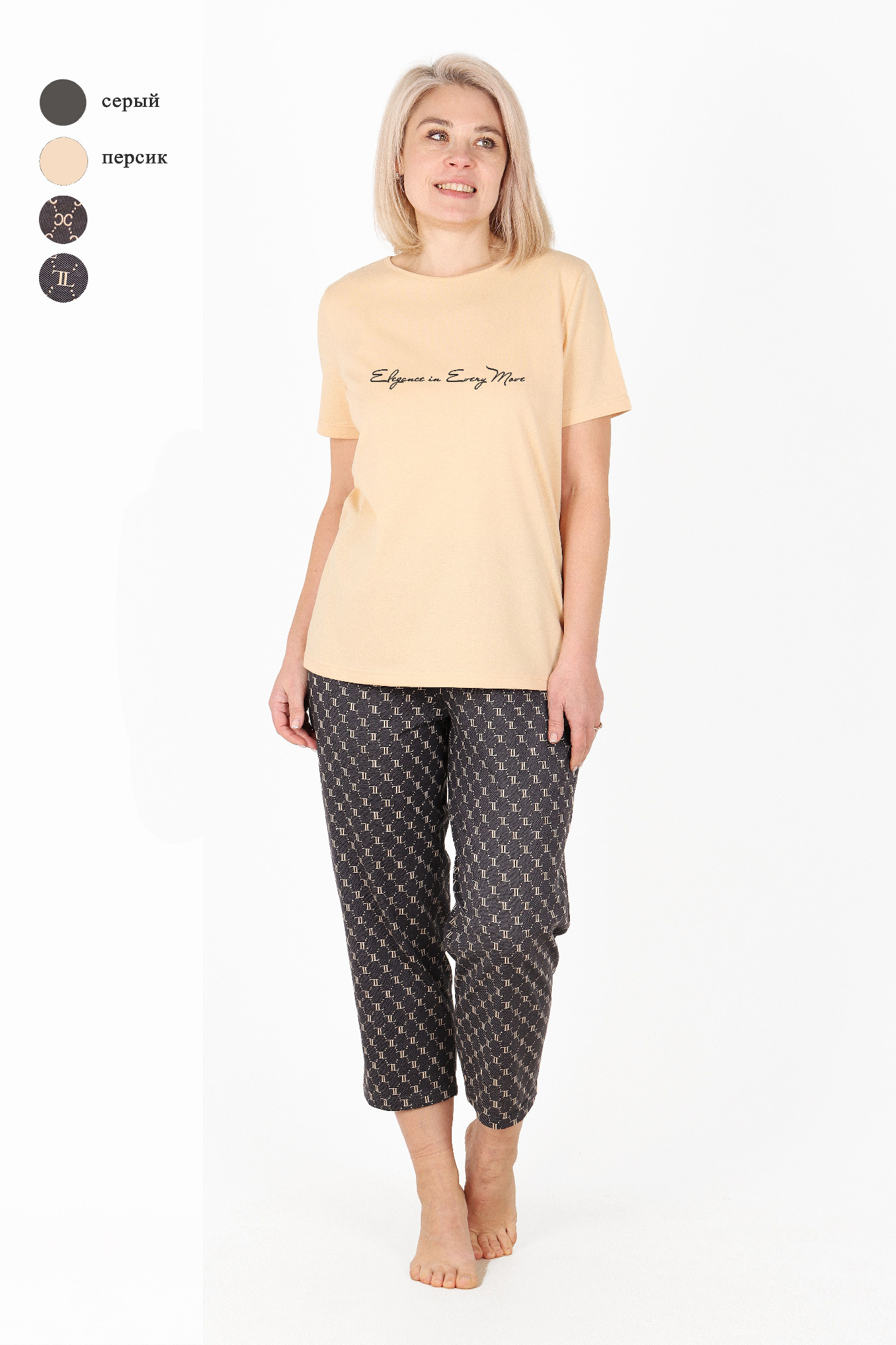Пижама молодежная из трикотажного полотна «кулирка» в комбинации двух видов: гладкокрашеного и с набивным рисунком, состоящая из футболки и брюк. Футболка – из гладкокрашеного полотна, классического покроя, с короткими втачными рукавами, горловиной овальной формы, обработанной притачной бейкой и принтом на полочке, выполненным в технике «шелкографии».Брюки – из полотна с набивным рисунком, классического покроя, с эластичной тесьмой по талии.