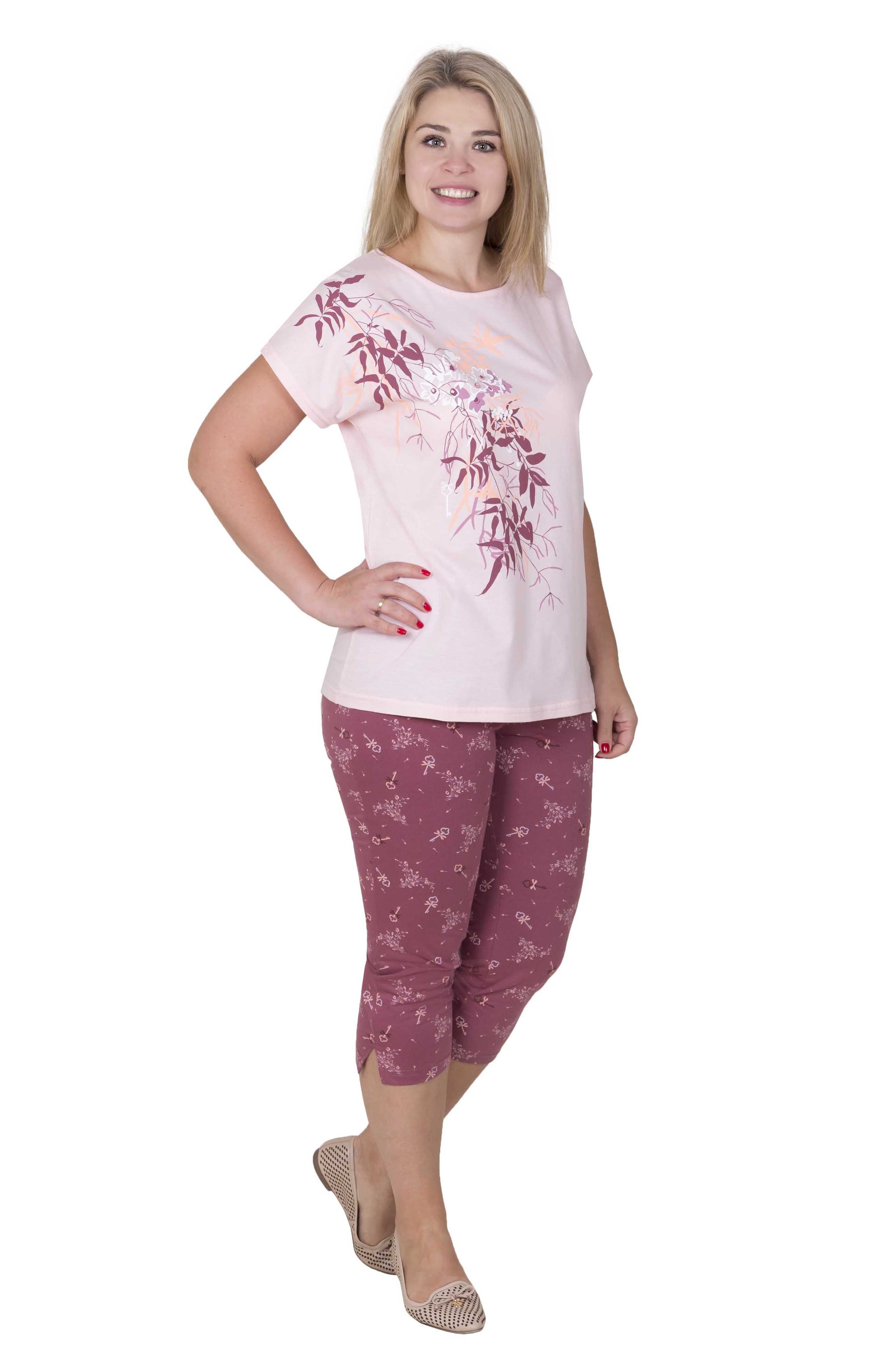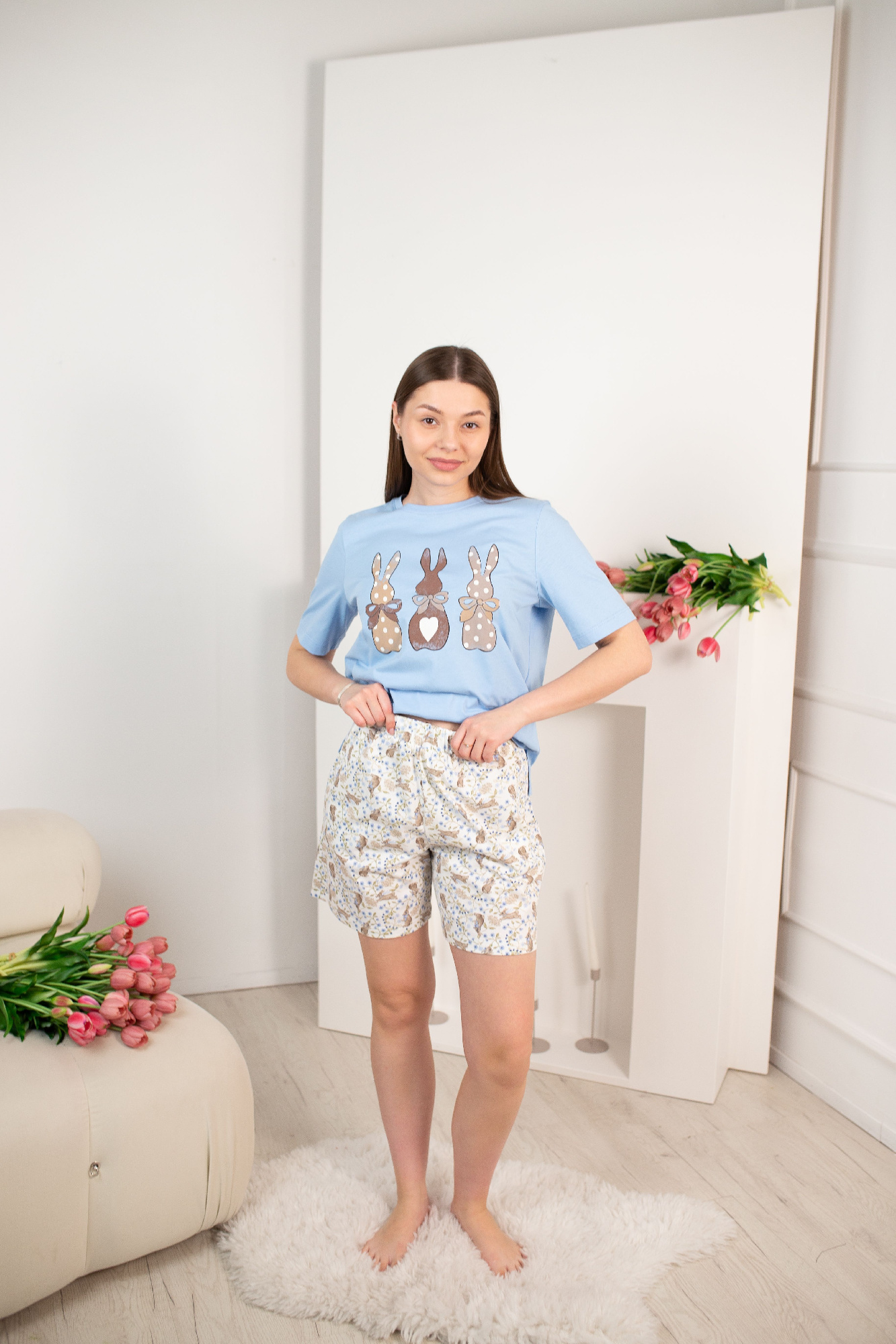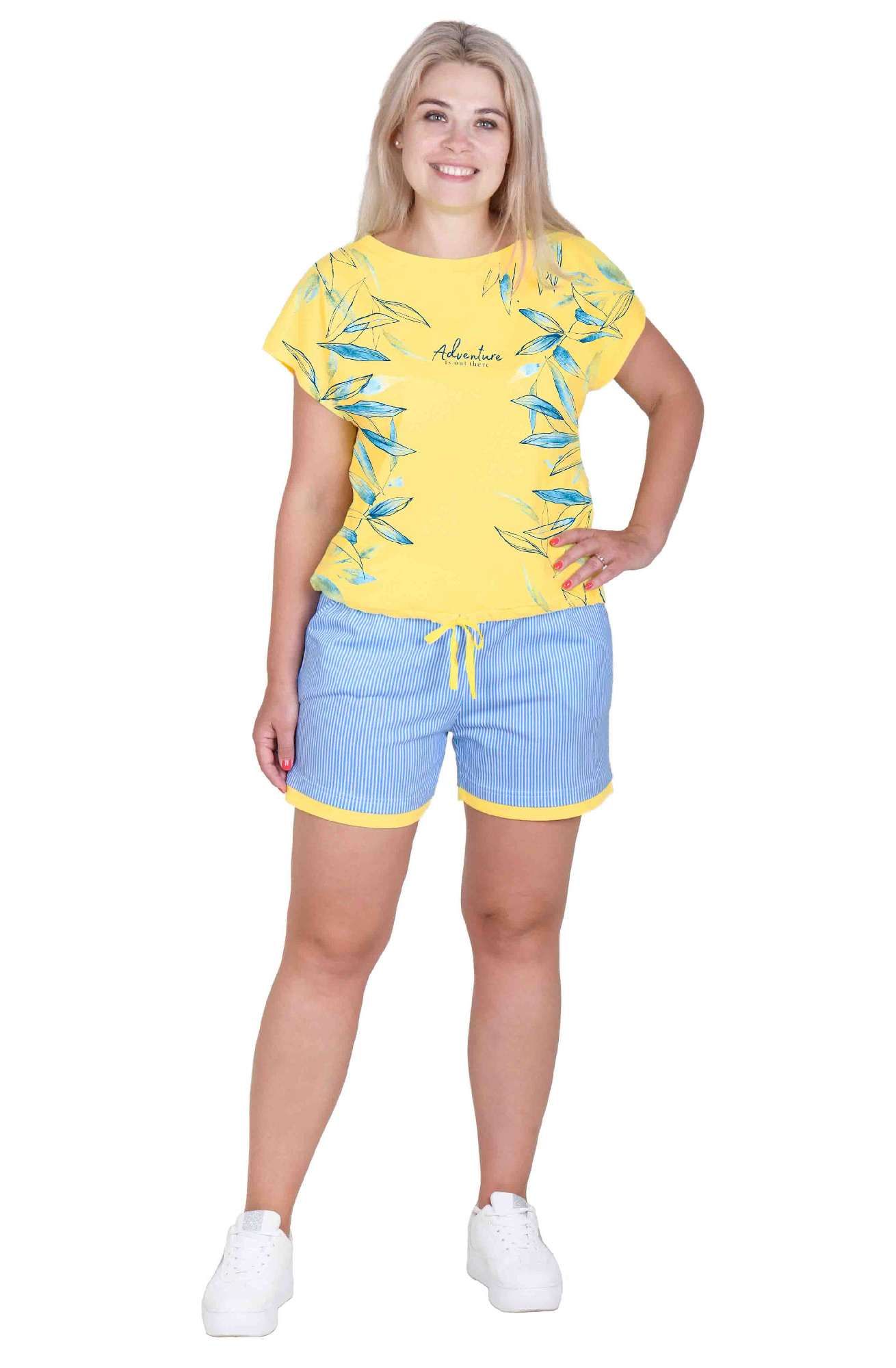 Костюм женский из трикотажного полотна "кулирка" в комбинации двух видов: гладкокрашеного и набивного с тематическим рисунком, состоящий из футболки и шорт. Футболка из гладкокрашеного полотна, с цельнокроенными короткими рукавами, горловиной овальной формы, обработанной втачной планкой и отделочной строчкой. В центре переда - принт, выполненгный в технике шелкографии. Шорты из полотна с набивным рисунком, свободного силуэта, на цельнокроенном поясе с эластичной тесьмой внутри.