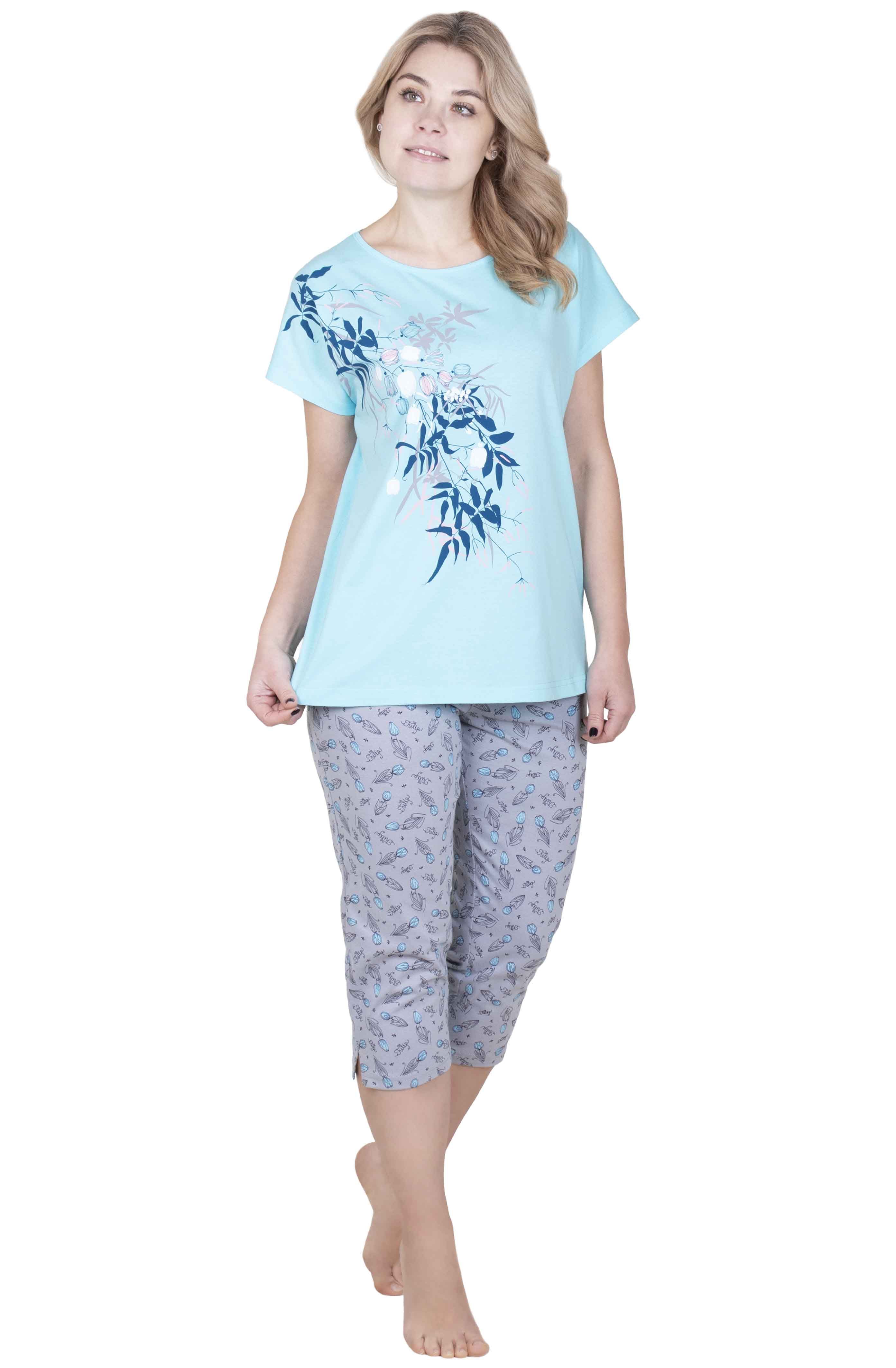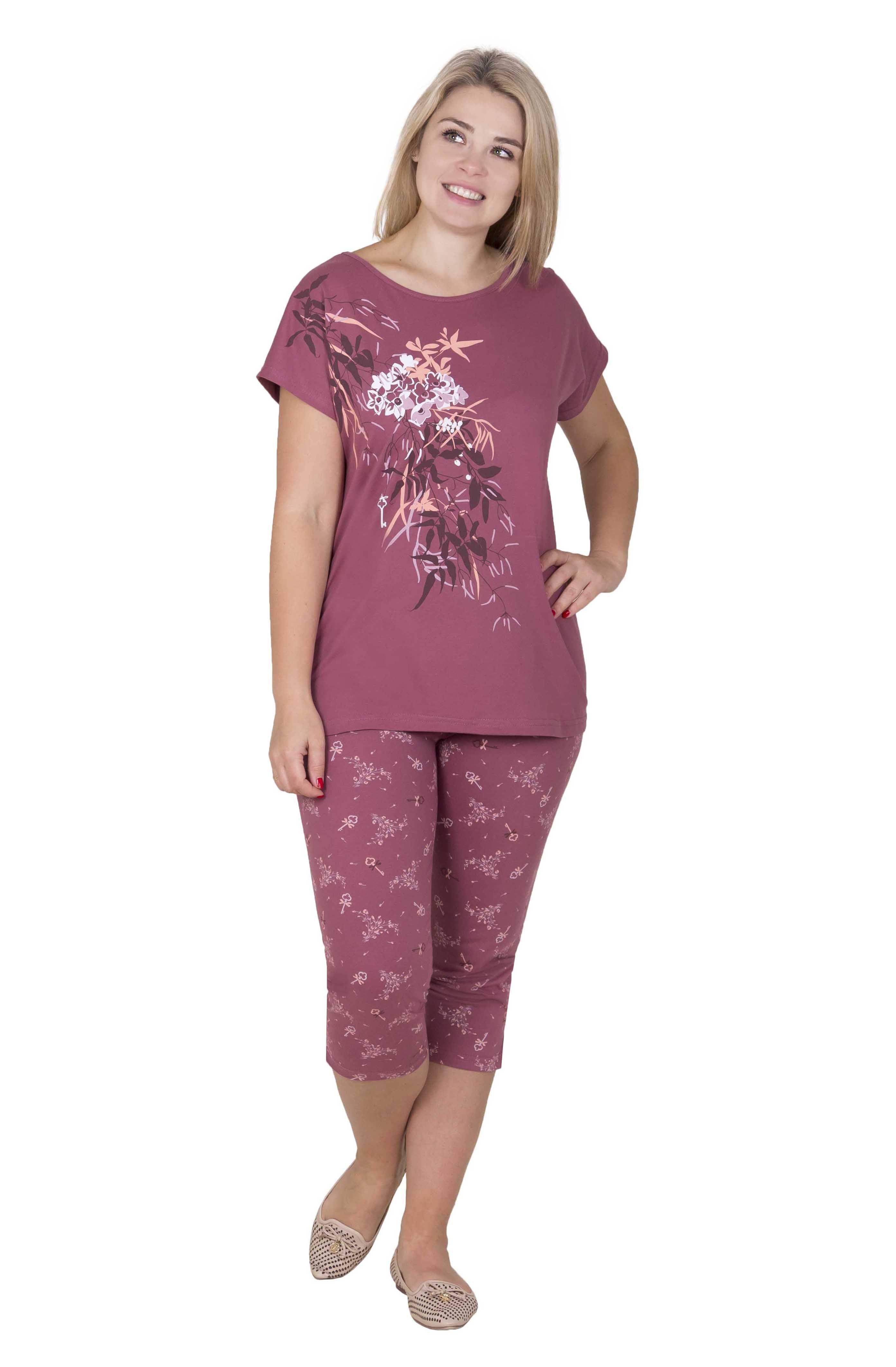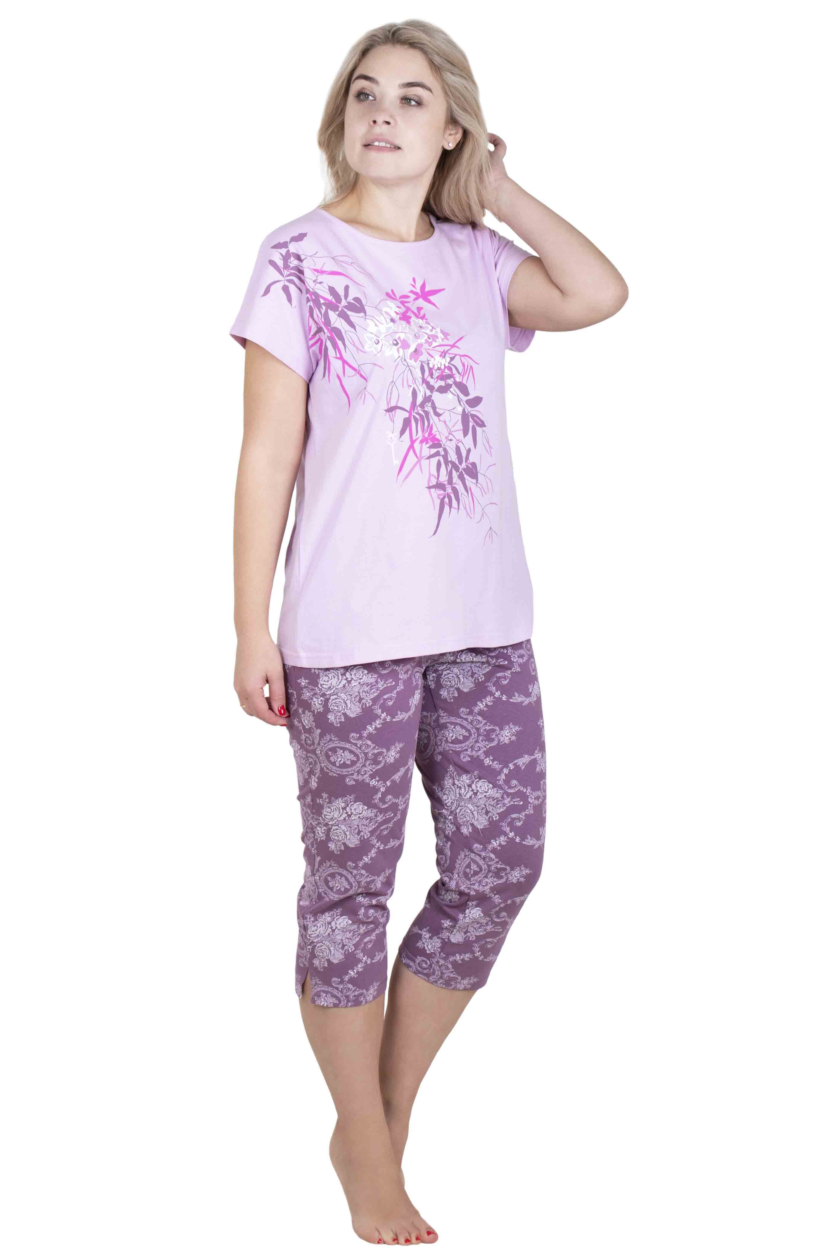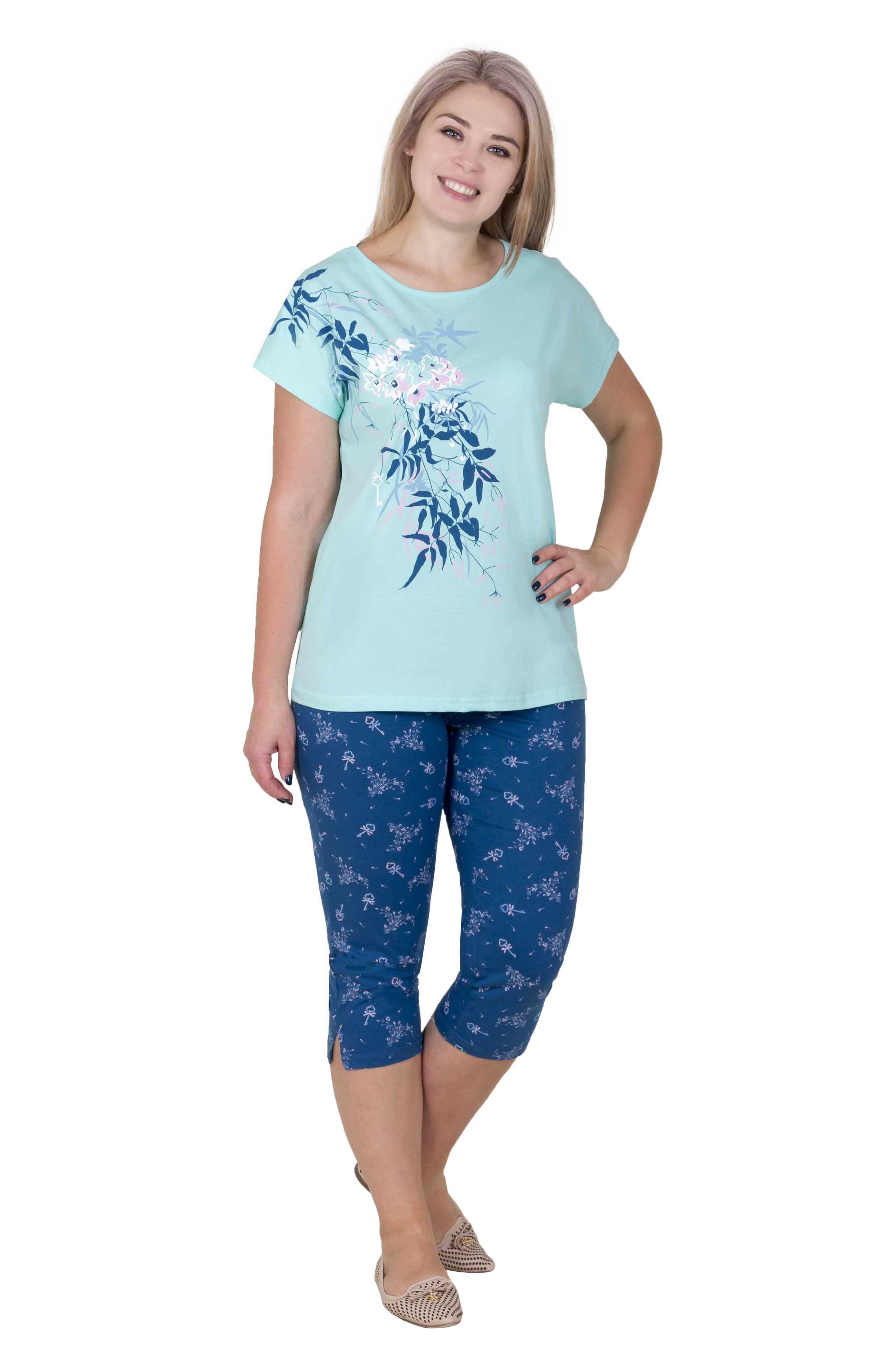Костюм женский из трикотажного полотна "кулирка" в комбинации двух видов: гладкокрашеного и набивного с тематическим рисунком, состоящий из футболки и шорт. Футболка из гладкокрашеного полотна, с цельнокроенными короткими рукавами, горловиной овальной формы, обработанной втачной планкой и отделочной строчкой. В центре переда - принт, выполненгный в технике шелкографии. Шорты из полотна с набивным рисунком, свободного силуэта, на цельнокроенном поясе с эластичной тесьмой внутри.
