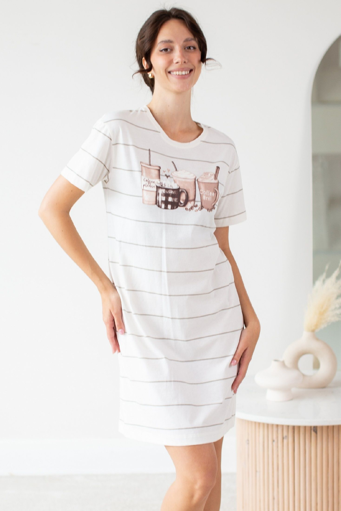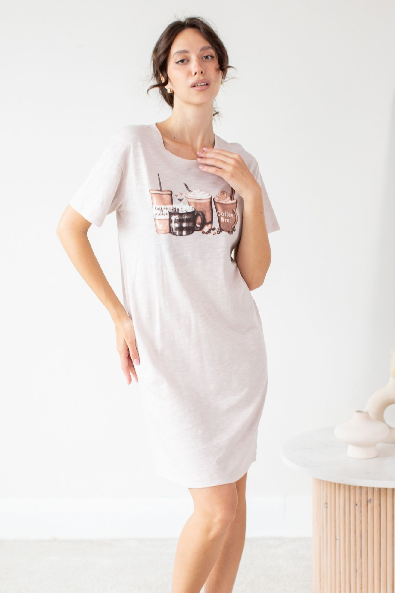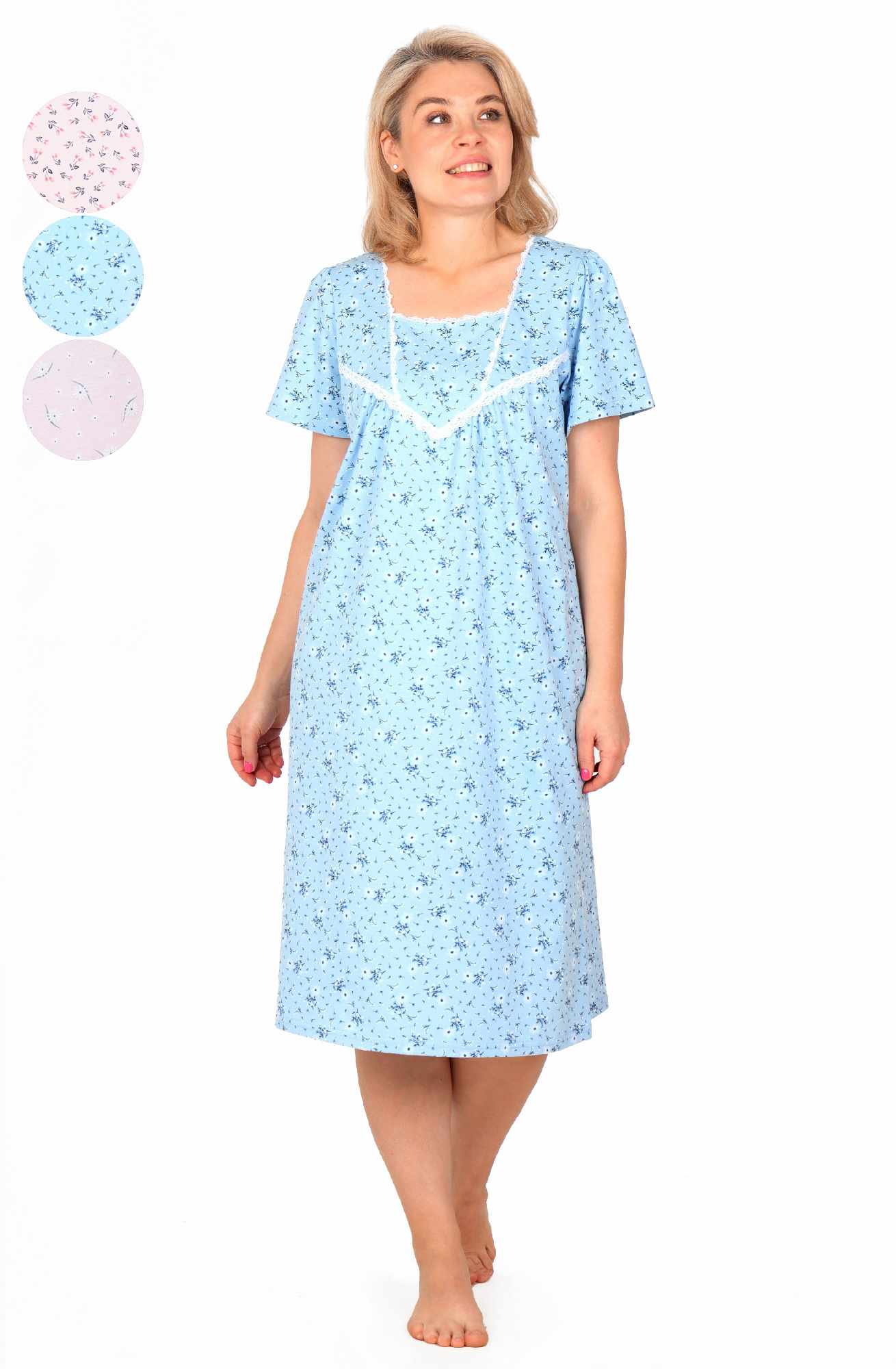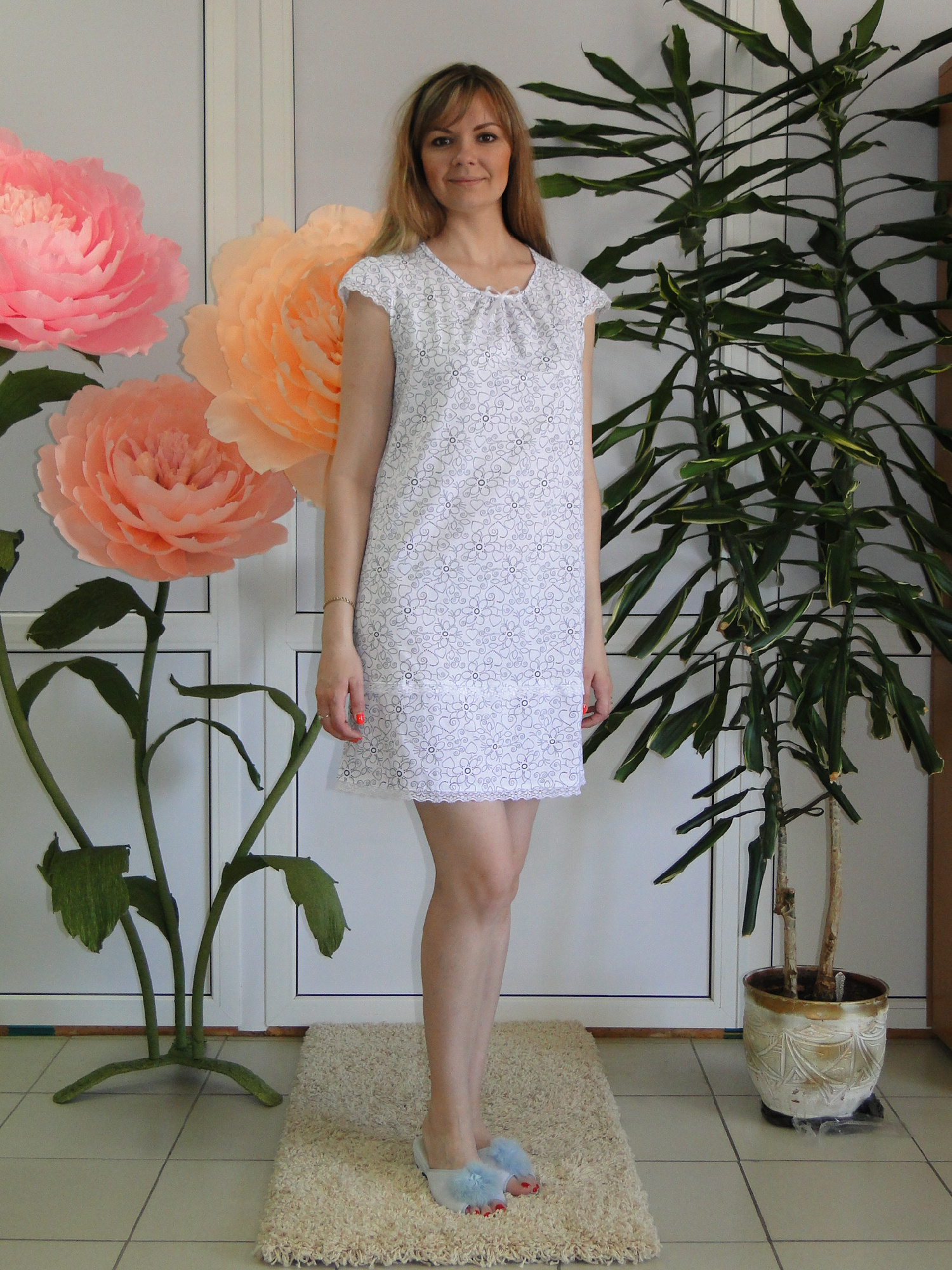 Сорочка женская из трикотажного полотна «кулирка» с набивным рисунком, свободного покроя, слегка расширенная книзу, с короткими втачными рукавами и горловиной овальной формы. Полочка – с отделочной деталью, повторяющей контур горловины, в шве притачивания которой симметрично относительно центра заложены 6 складочек-защипов. Наружный край горловины и низ рукавов обработаны узким кружевом.