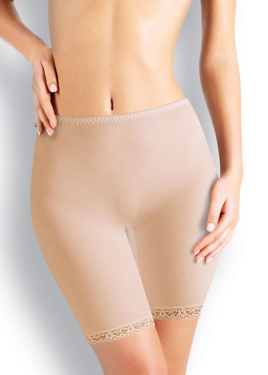 Трусы панталоны женские из плотного эластичного хлопкового полотна. Обработка по талии - ажурная резинка с фестоном, по ноге - узкое кружево.