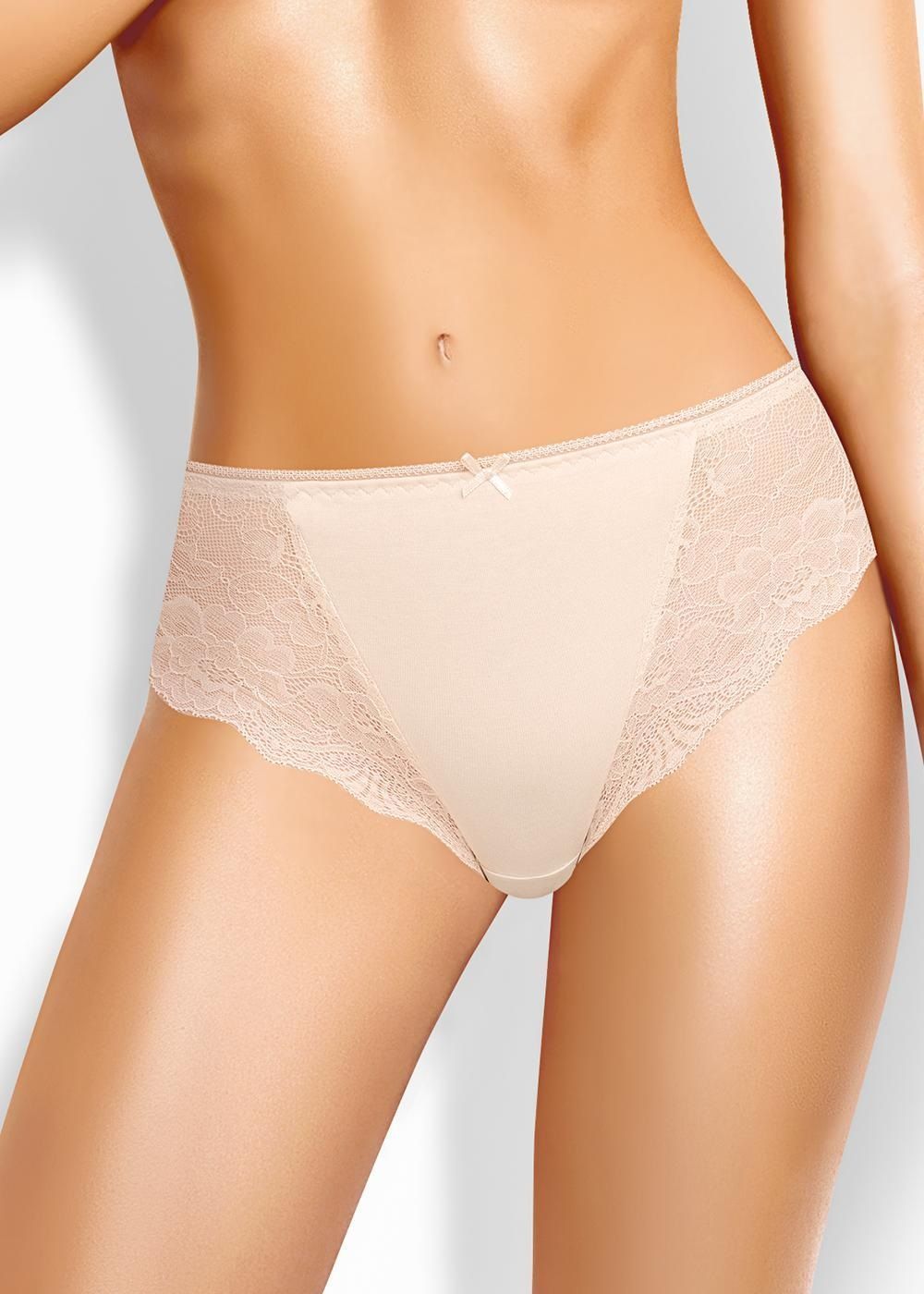 Трусы слипы женские из эластичного хлопкового полотна. По переду рез с кружевными вставками. Обработка краев по талии и ноге ажурная резинка (точечный зигзаг). По переду атласный бант.