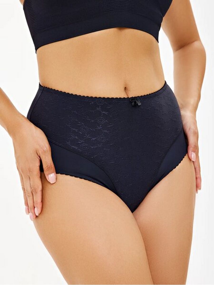 Трусы макси с высокой линией талии выполнены из полиамидного полотна с корректирующим эффектом. В области живота внутренняя дополнительная корректирующая вставка из сетки. Задняя часть изделия выполнена из мягкого стечатого полотна с узором без резинки на ягодицах и боковые швы смещены на перед изделия, что обеспечивает комфорт и незаметно под одеждой. Силиконовая лента в верхней части изделия исключает возможность сползания и скатывания.