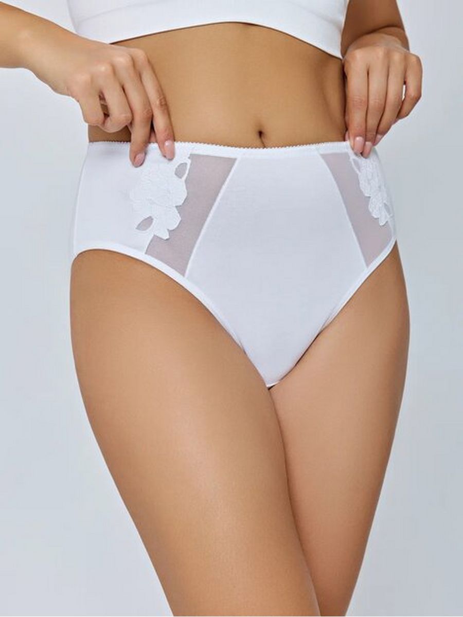 Трусы макси от бренда MADAMODA, выполнены из высококачественного хлопка с эластаном. На передней части изделия - вставки из сетки и элегантная вышивка. Трусы имеют высокую посадку и средние по высоте боковые детали.