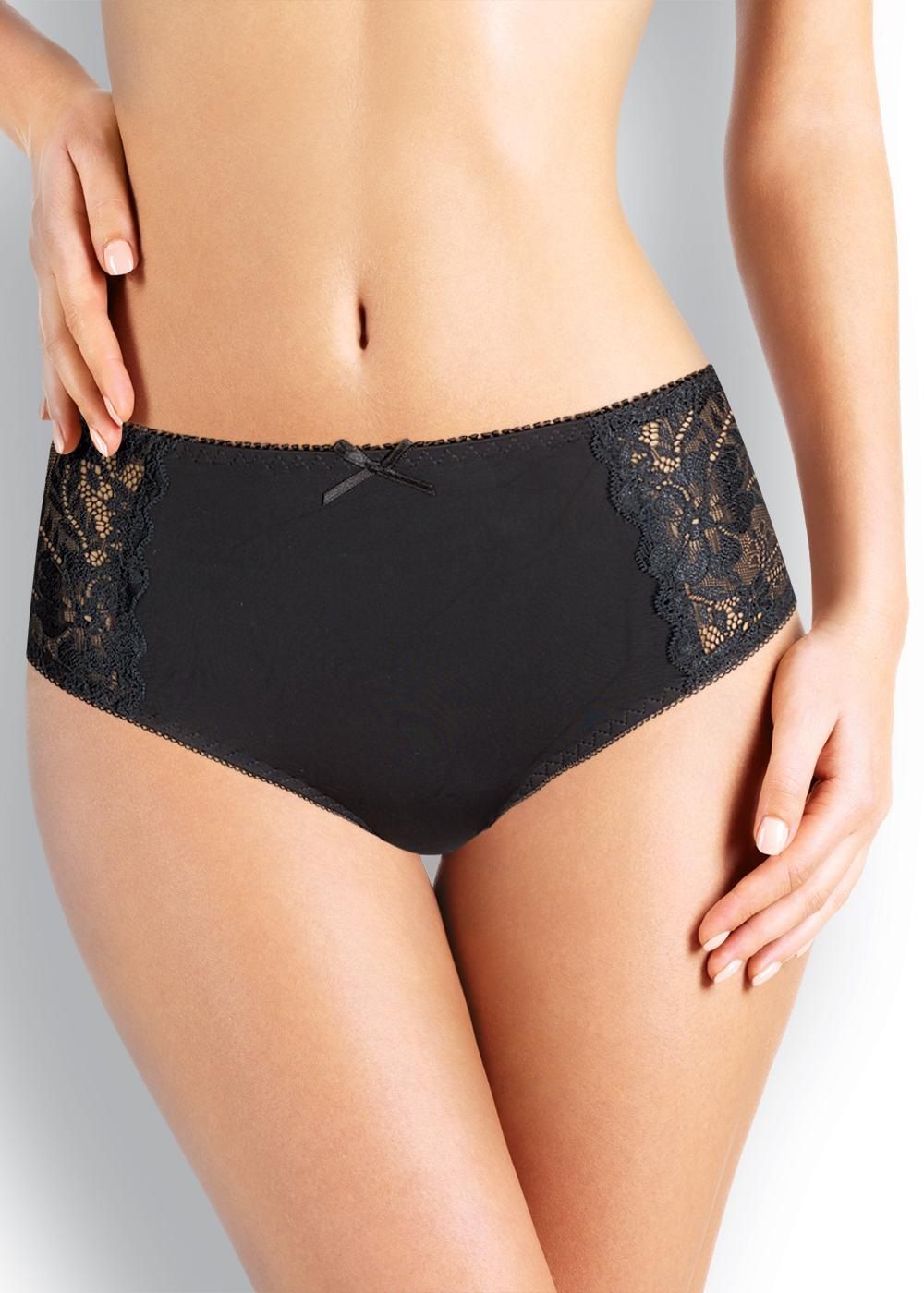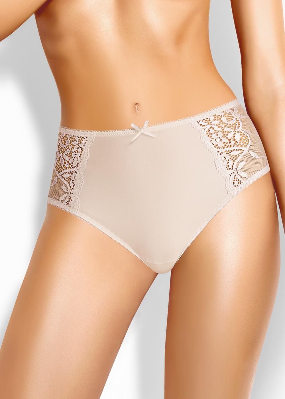 Трусы-макси женские из полиамида. Обработка краев - ажурная резинка с фестоном. По бокам вставки из кружева. По переду бант. Производство Китай.