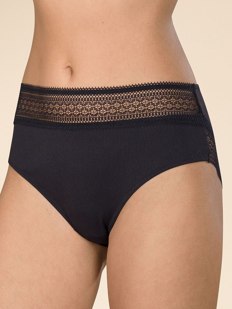 Трусы бикини женские из полиамида с эластаном. Обработка краев по талии - ажурная широкая резинка, по ноге - подклееный край. Хлопковая ластовица.