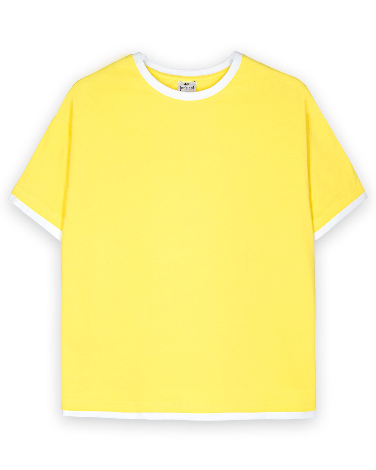 Футболка женская (оверсайз) свободного силуэта, с коротким рукавом. Горловина круглая, обработана воротником из рибаны молочного цвета. Горловина спинки внутри обработана бейкой из кулирки. По горловине полочки отделочная строчка. Низ изделия и рукавов обработан манжетом из кулирки молочного цвета. Модель рассчитана на рост 164-170см.
