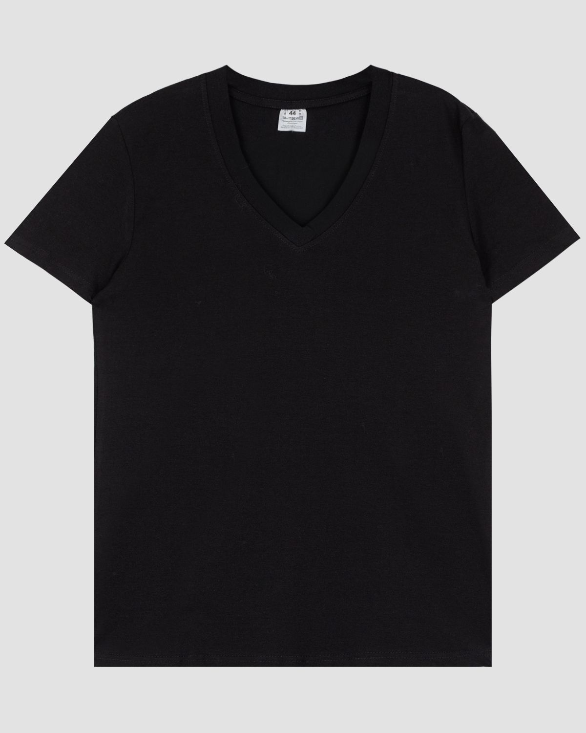 Футболка женская прямого силуэта с втачным коротким рукавом. Горловина V-образная, обработана воротником из основного полотна, в цвет изделия. Горловина спинки внутри обработана бейкой из кулирки. По горловине полочки отделочная строчка. Низ изделия и рукавов обработан швом вподгибку. Модель рассчитана на рост 164-170.