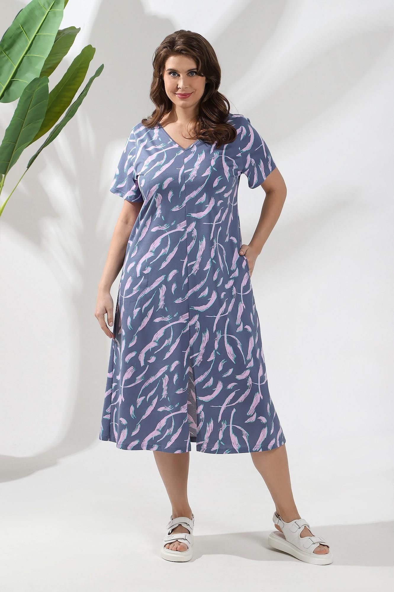 Платье женское из трикотажного полотна «кулирка» с набивным рисунком, полуприталенного силуэта, с V-образной формой горловины, короткими втачными рукавами, карманами в боковых швах. Полочка состоит из двух деталей, в шве стачивания выполнен разрез.
