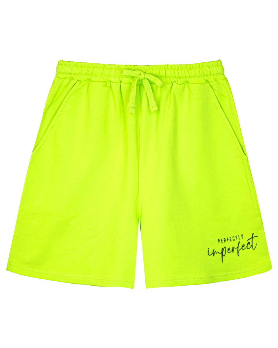 Шорты женские прямого силуэта. Отрезной пояс из основного полотна, с эластичной тесьмой закрепленной в шов. По поясу шорт вставлен плоский утягивающий шнурок. На передней половинке шорт выполнены карманы с отрезным бочком. Низ изделия обработан швом в подгибку. На левой передней половинке шорт принт шелкография. Надпись переводится как "Идеально неидеальная". Модель рассчитана на рост 164-170см.