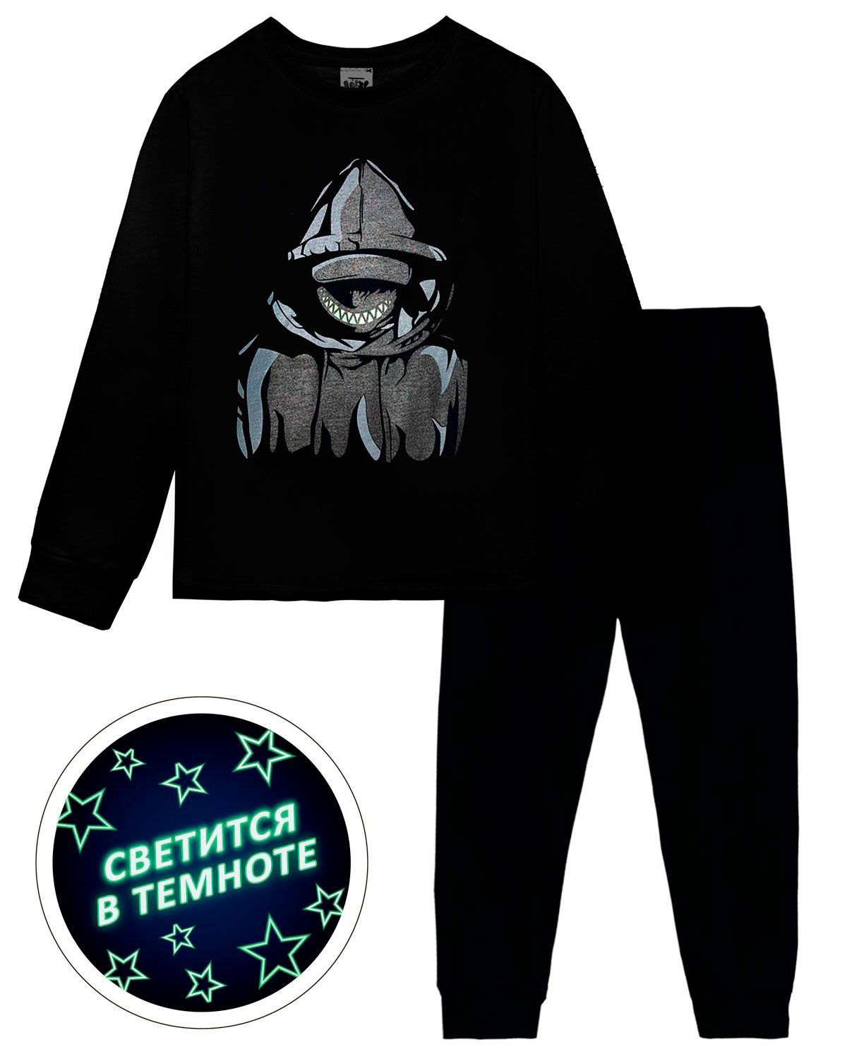 Пижама для мальчика, состоящая из джемпера и брюк. Джемпер прямого силуэта, с втачным длинным рукавом. Горловина круглая обработана обтачкой из рибаны. По низу рукавов манжеты из рибаны. Низ изделия обработан швом вподгибку. На полочке принт Шелкография с флуоресцентной краской. ПРИНТ СВЕТИТСЯ В ТЕМНОТЕ. Брюки прямого силуэта, из однотонного полотна. Пояс цельнокроенный, с эластичной тесьмой внутри. По низу изделия манжеты из рибаны.