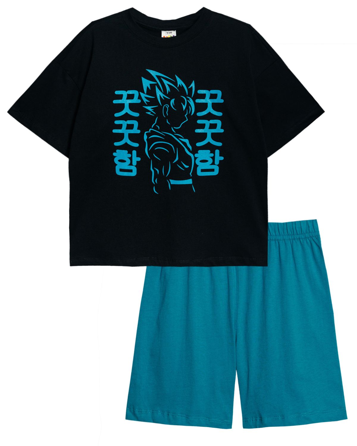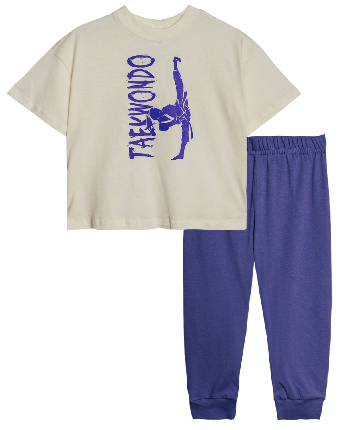 Пижама для мальчика, состоящая из футболки и брюк. Футболка свободного силуэта (оверсайз), с коротким рукавом. Горловина круглая обработана обтачкой из рибаны. Низ изделия и рукава обработан швом вподгибку. На полочке принт Шелкография. Надпись переводится как "Тхэквондо". Брюки прямого силуэта, из однотонного полотна. Пояс цельнокроенный, с эластичной тесьмой внутри. По низу изделия манжеты из рибаны.