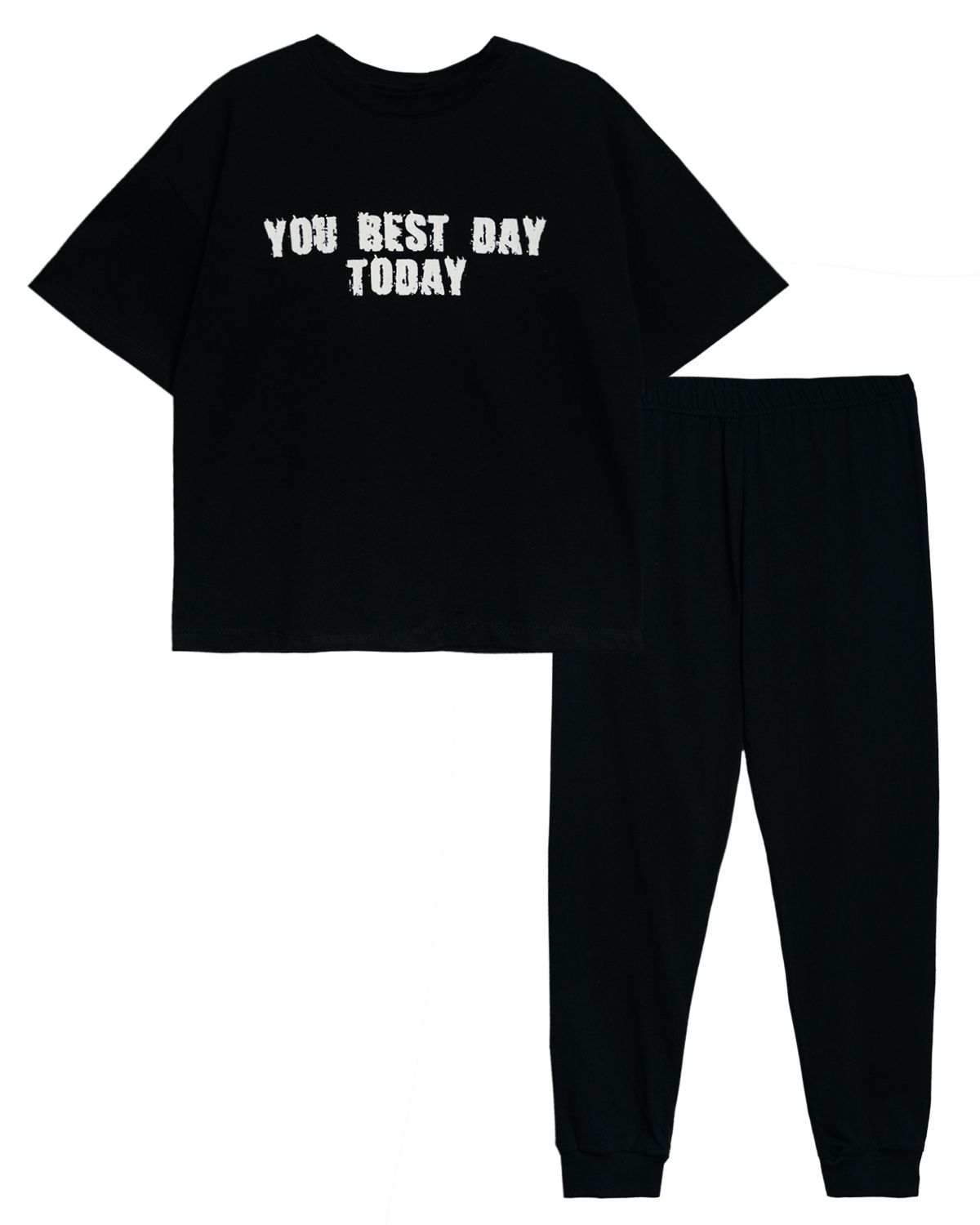 Пижама для мальчика, состоящая из футболки и брюк. Футболка свободного силуэта (оверсайз), с коротким рукавом. Горловина круглая обработана обтачкой из рибаны. Низ изделия и рукава обработан швом вподгибку. На полочке принт Шелкография. Надпись переводится как "Твой лучший день сегодня". Брюки прямого силуэта, из однотонного полотна. Пояс цельнокроенный, с эластичной тесьмой внутри. По низу изделия манжеты из рибаны.