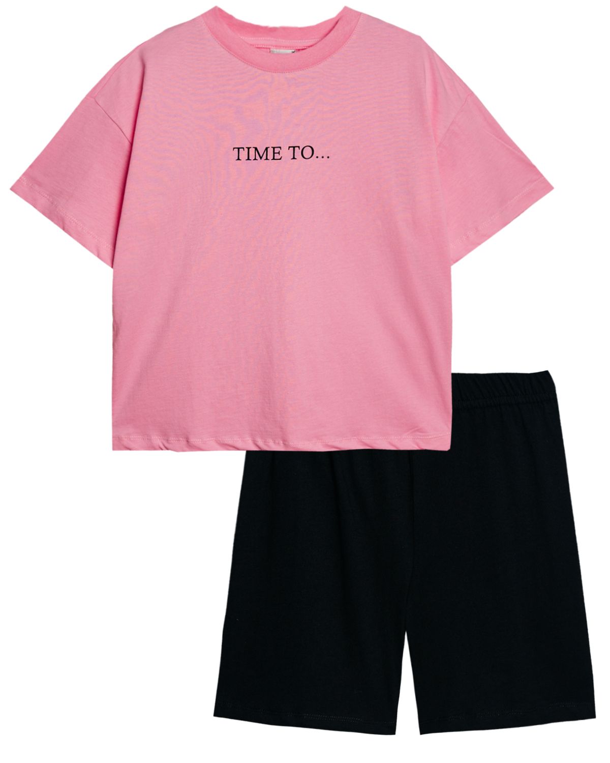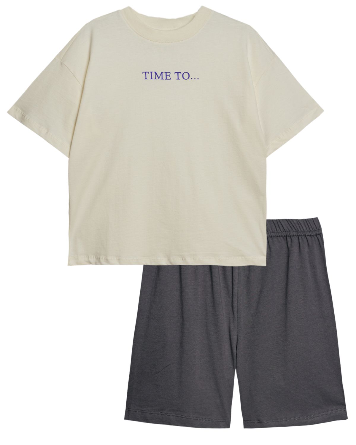 Пижама для девочки, состоящая из футболки и шорт. Футболка свободного силуэта (оверсайз), с коротким рукавом. Горловина круглая обработана обтачкой из рибаны. Низ изделия и рукава обработан швом вподгибку. На полочке принт Шелкография. Надпись переводится как "Время для...". Шорты прямого силуэта, из однотонного полотна. Пояс цельнокроенный, с эластичной тесьмой внутри. Низ изделия обработан швом вподгибку.