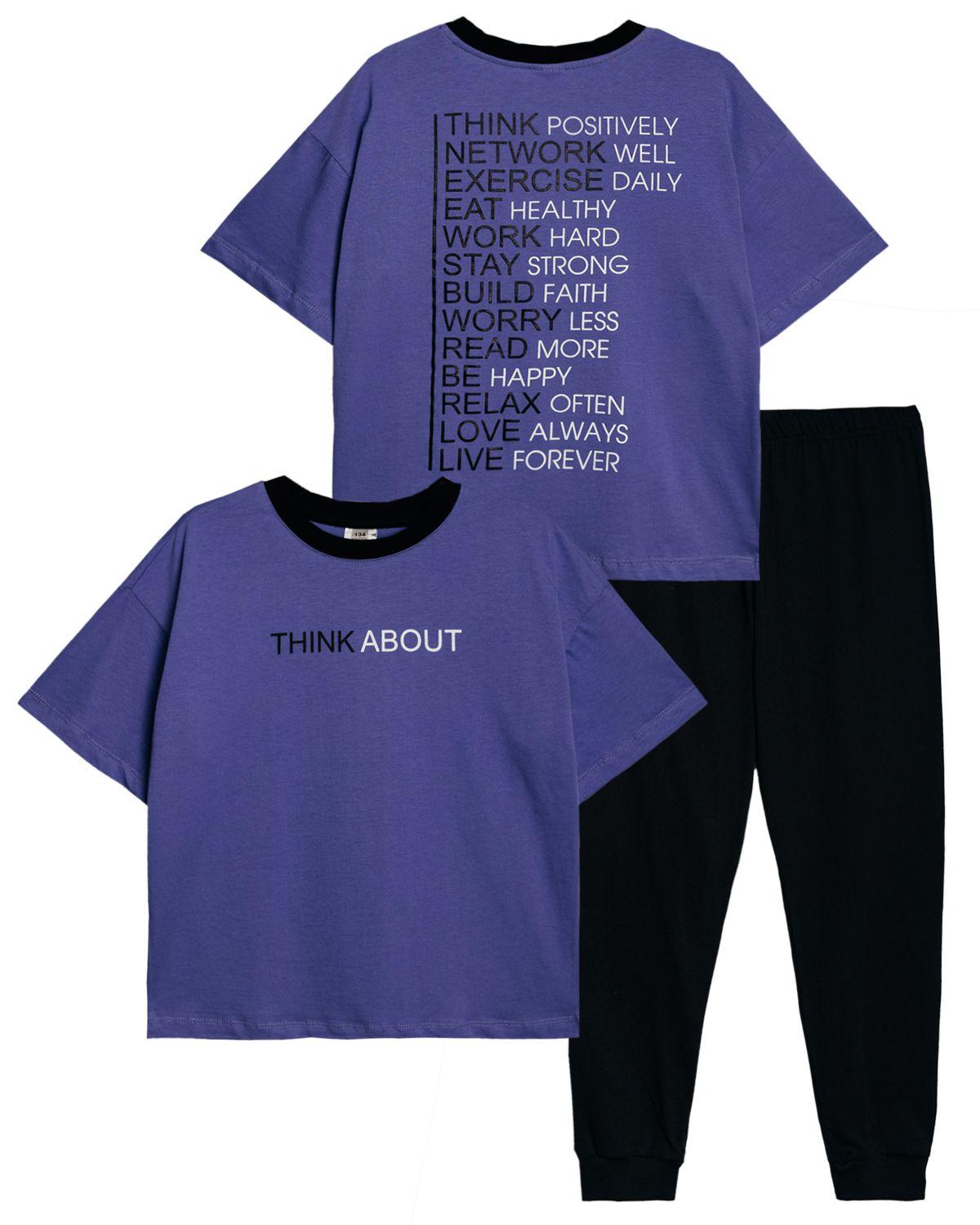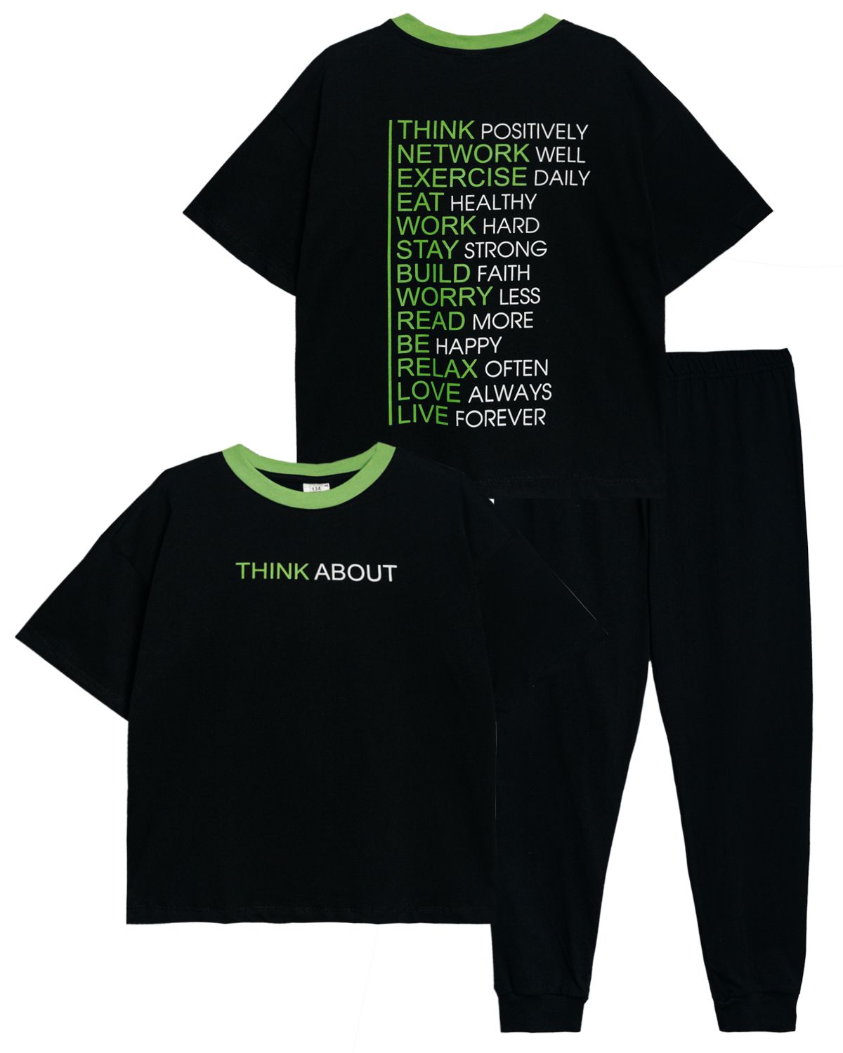 Пижама для мальчика, состоящая из футболки и брюк. Футболка свободного силуэта (оверсайз), с коротким рукавом. Горловина круглая обработана обтачкой из рибаны. Низ изделия и рукава обработан швом вподгибку. На полочке и спинке принт Шелкография. Надпись переводится как "Думайте;Думайте о хорошем;Хорошо общайтесь;Занимайтесь спорто каждый день;Питайтесь здоровой пищей;Усердно работайте;Оставайтесь сильными;Укрепляйте веру; Меньше беспокойтесь;Больше читайте; Будьте счастливы;Чаще отдыхайте;Всегда любите;Живите вечно". Брюки прямого силуэта, из однотонного полотна. Пояс цельнокроенный, с эластичной тесьмой внутри. По низу изделия манжеты из рибаны.