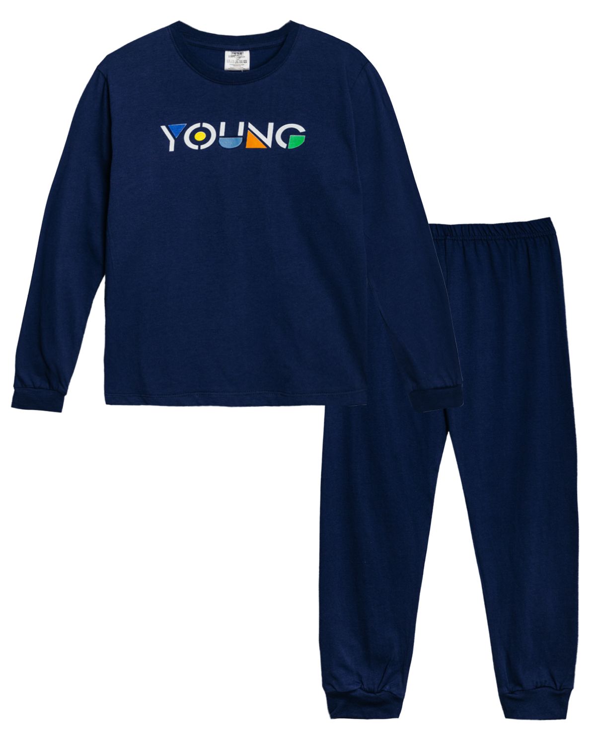 Пижама для мальчика, состоящая из джемпера и брюк. Джемпер прямого силуэта, с втачным длинным рукавом. Горловина круглая обработана обтачкой из рибаны. По низу рукавов манжеты из рибаны. Низ изделия обработан швом вподгибку. На полочке принт Шелкография. Надпись переводится как "Молодой". Брюки прямого силуэта, из однотонного полотна. Пояс цельнокроенный, с эластичной тесьмой внутри. По низу изделия манжеты из рибаны.