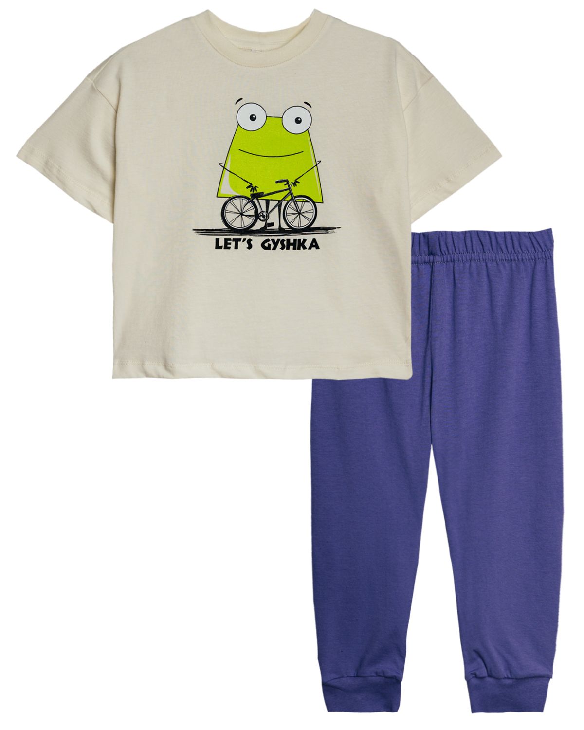 Пижама для мальчика, состоящая из футболки и брюк. Футболка свободного силуэта (оверсайз), из однотонного полотна, с коротким рукавом. Горловина круглая обработана обтачкой из рибаны. Низ изделия и рукава обработан швом вподгибку. На полочке принт Шелкография. Надпись переводится как "Вперед лягушка". Брюки прямого силуэта, из однотонного полотна. Пояс цельнокроенный, с эластичной тесьмой внутри. По низу изделия манжеты из рибаны.