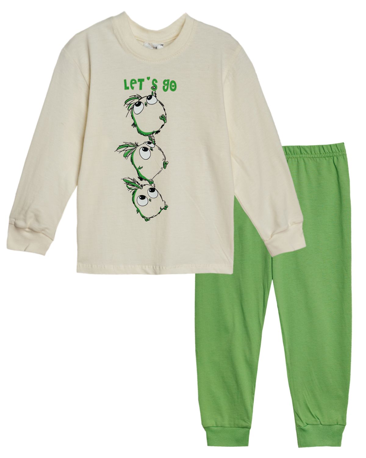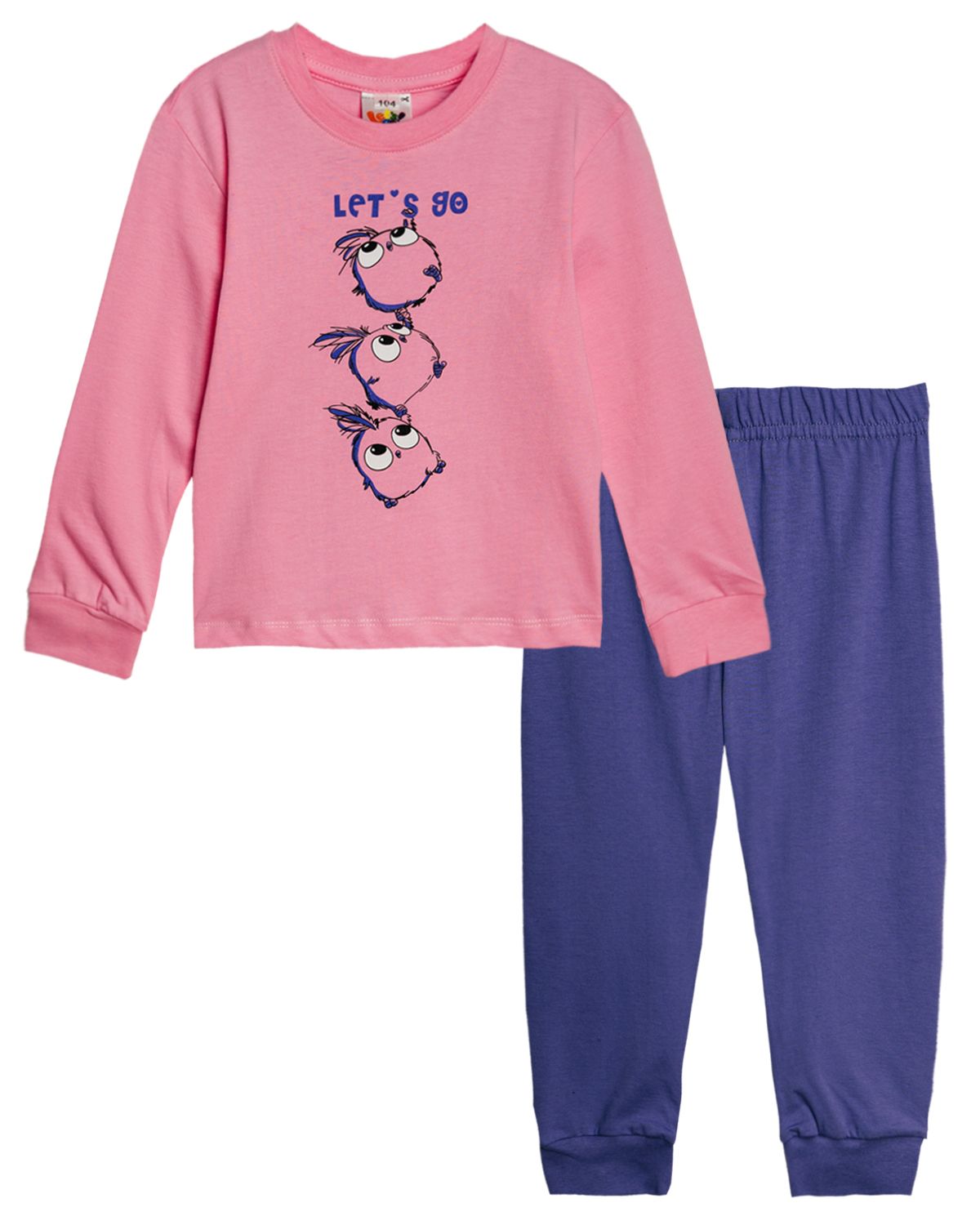 Пижама для девочки, состоящая из джемпера и брюк. Джемпер прямого силуэта, с втачным длинным рукавом. Горловина круглая обработана обтачкой из рибаны. По низу рукавов манжеты из рибаны. Низ изделия обработан швом вподгибку. На полочке принт Шелкография. Надпись переводится как "Вперед". Брюки прямого силуэта, из однотонного полотна. Пояс цельнокроенный, с эластичной тесьмой внутри. По низу изделия манжеты из рибаны.
