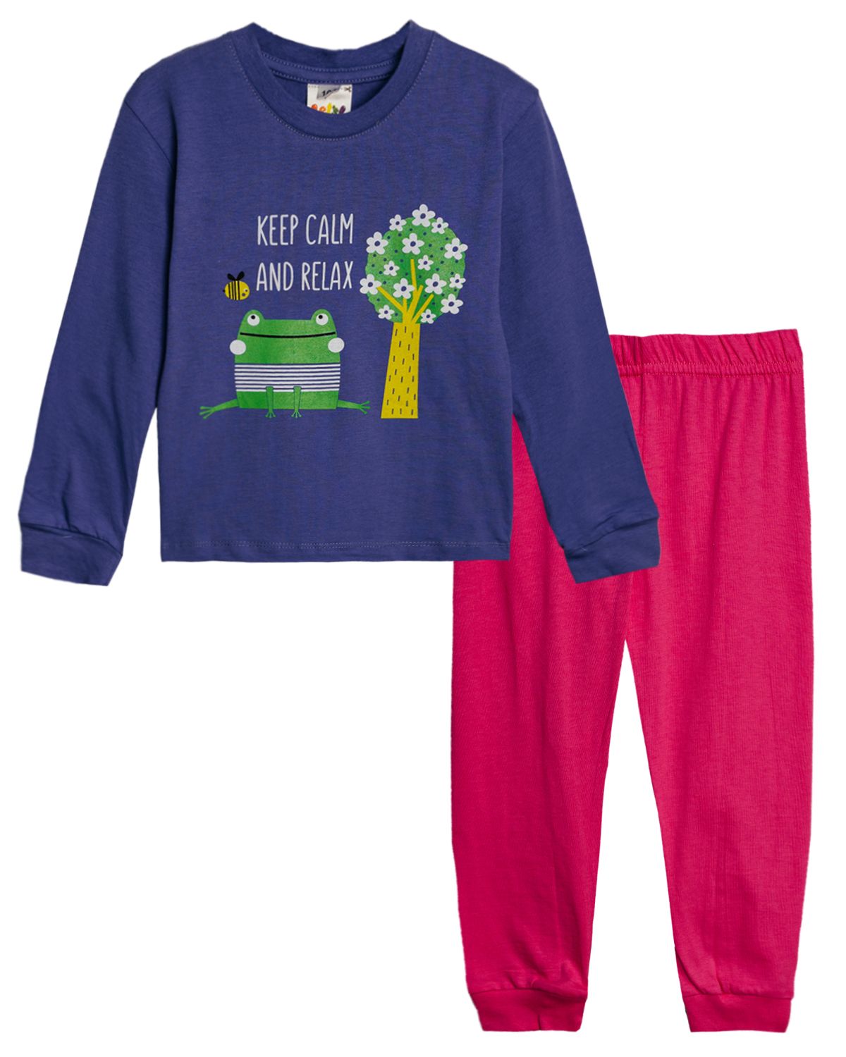 Пижама для девочки, состоящая из джемпера и брюк. Джемпер прямого силуэта, с втачным длинным рукавом. Горловина круглая обработана обтачкой из рибаны. По низу рукавов манжеты из рибаны. Низ изделия обработан швом вподгибку. На полочке принт Шелкография. Надпись переводится как "Сохраняй спокойствие и отдыхай". Брюки прямого силуэта, из однотонного полотна. Пояс цельнокроенный, с эластичной тесьмой внутри. По низу изделия манжеты из рибаны.