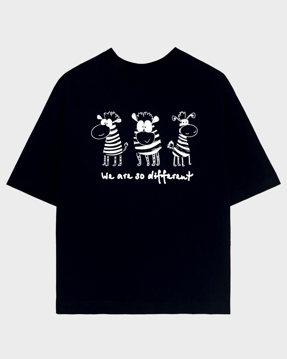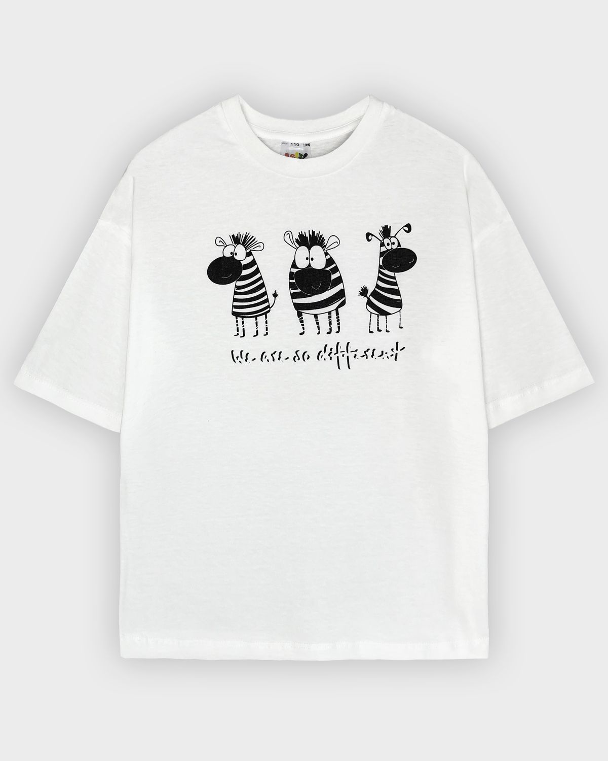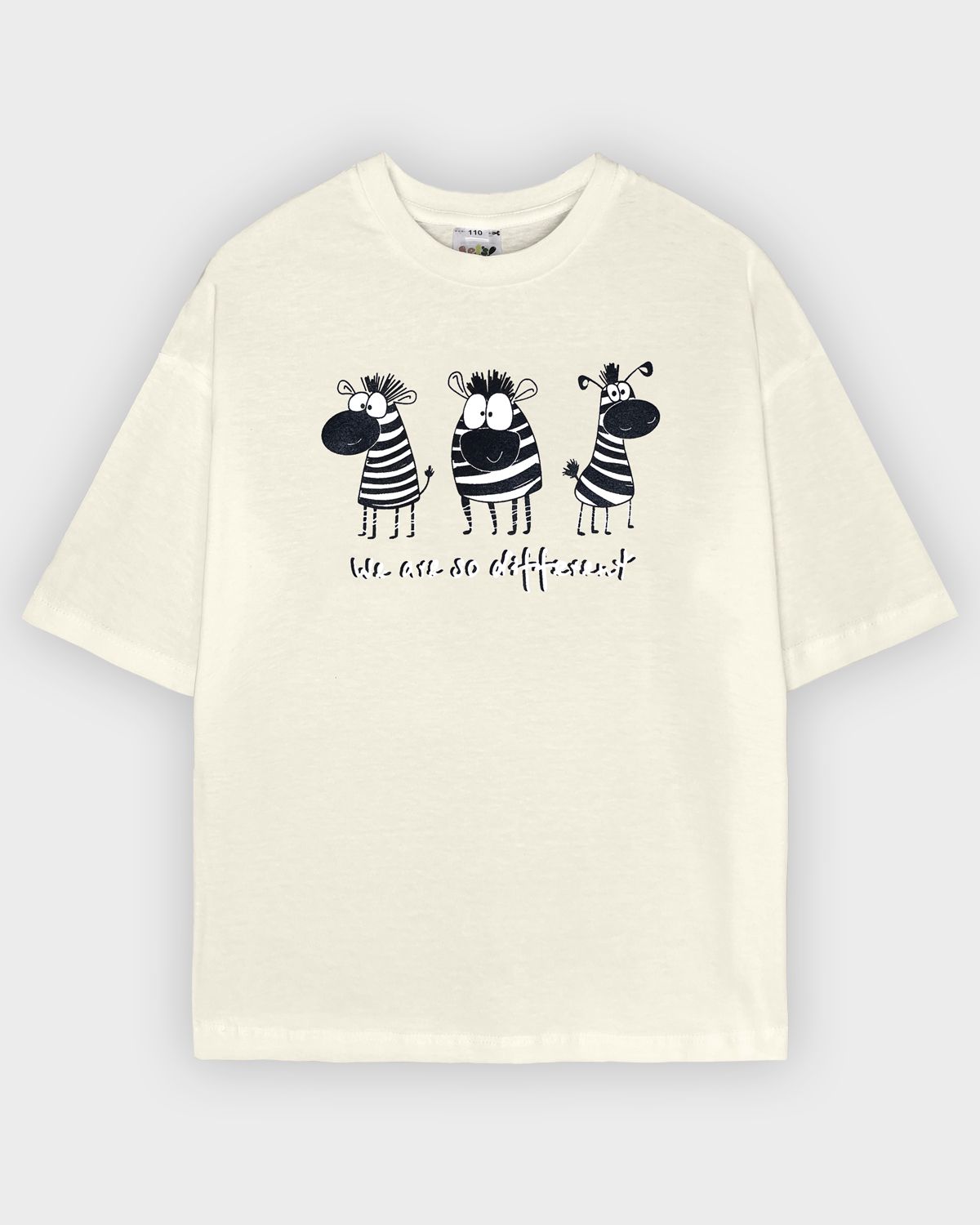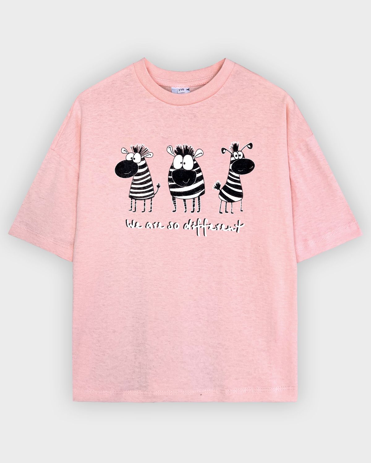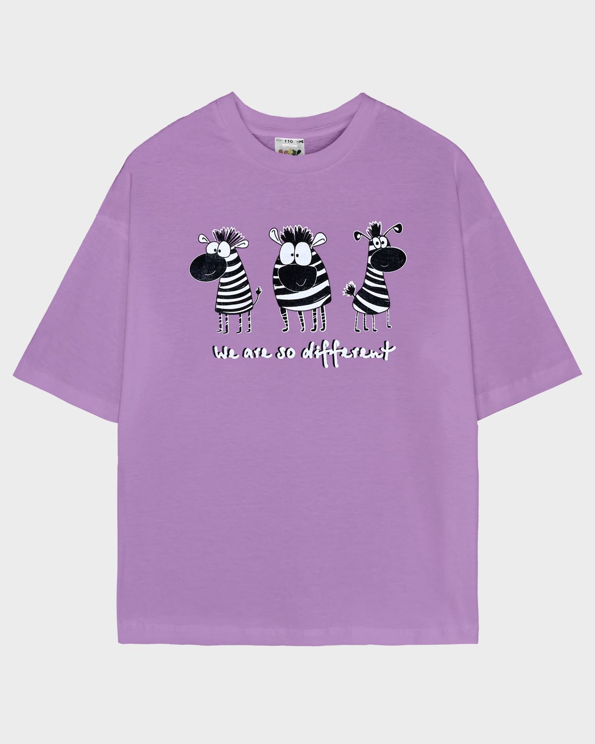 Футболка для девочки свободного силуэта (оверсайз) с коротким рукавом. Горловина круглая, обработана обтачкой из рибаны. Низ изделия и рукава обработаны швом вподгибку. На полочке принт Шелкография. Надпись переводится как "Мы такие разные".