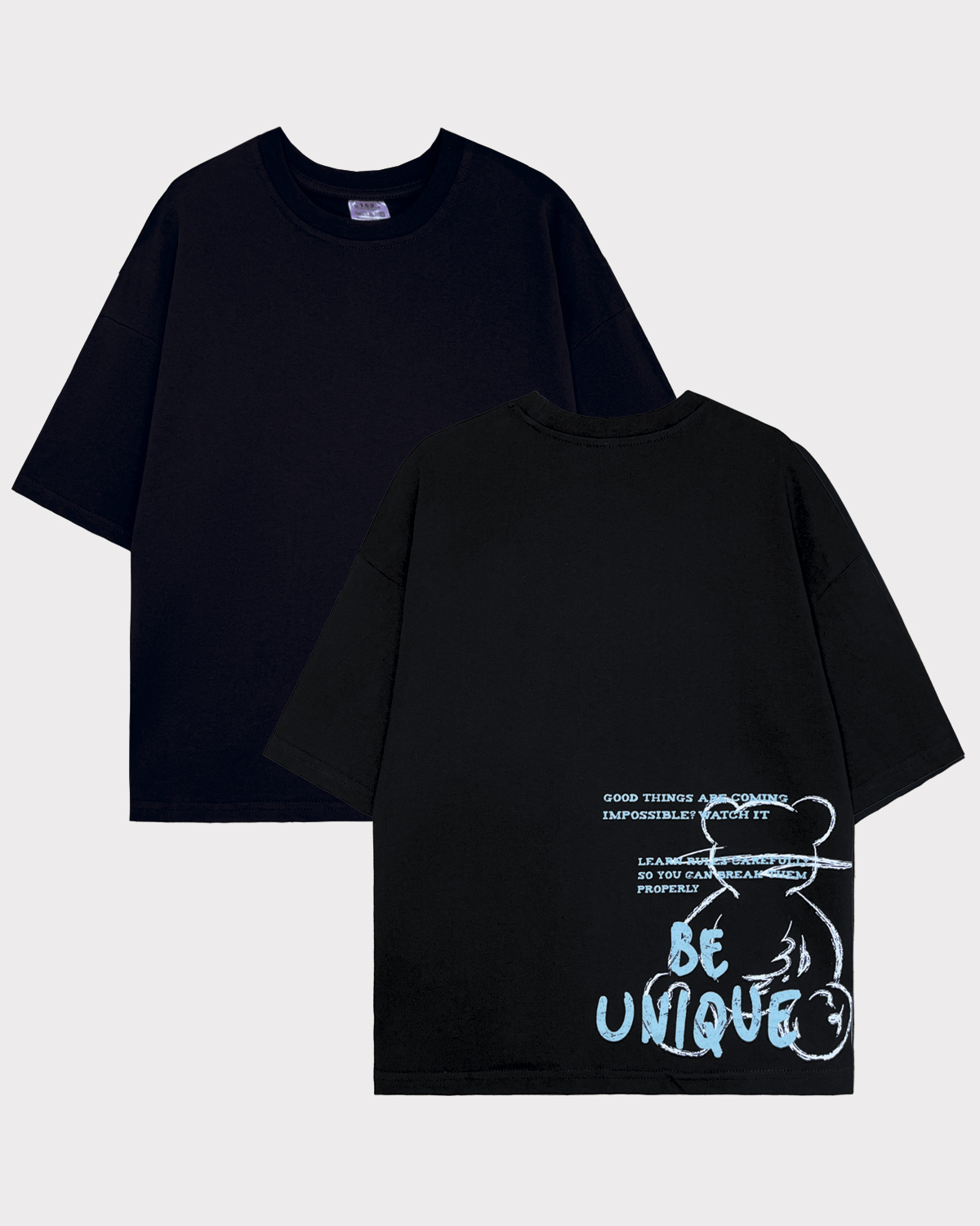 Футболка детская свободного силуэта (оверсайз) с коротким рукавом. Горловина круглая, обработана обтачкой горловиной из рибаны. Низ изделия и рукава обработаны швом вподгибку. На полочке принт Шелкография. Надпись переводится как "Будь уникальным;Грядут хорошие события;Невозможно?Наблюдай за этим;Тщательно изучай правила,чтобы правильно их нарушать".