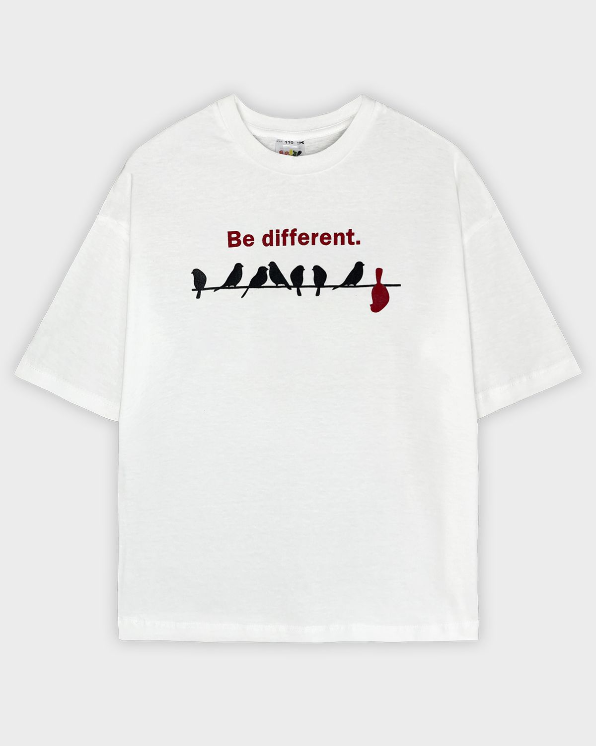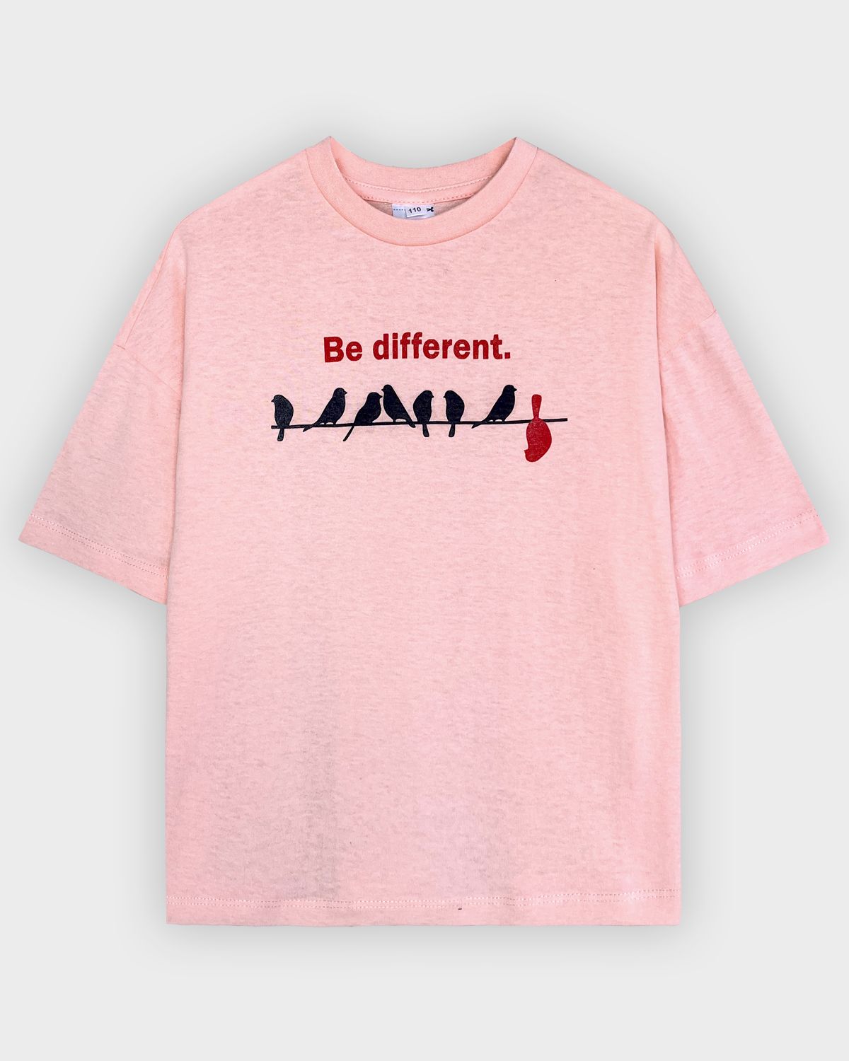 Футболка для девочки свободного силуэта (оверсайз) с коротким рукавом. Горловина круглая, обработана обтачкой из рибаны. Низ изделия и рукава обработаны швом вподгибку. На полочке принт Шелкография. Надпись переводится как "Будь другой".