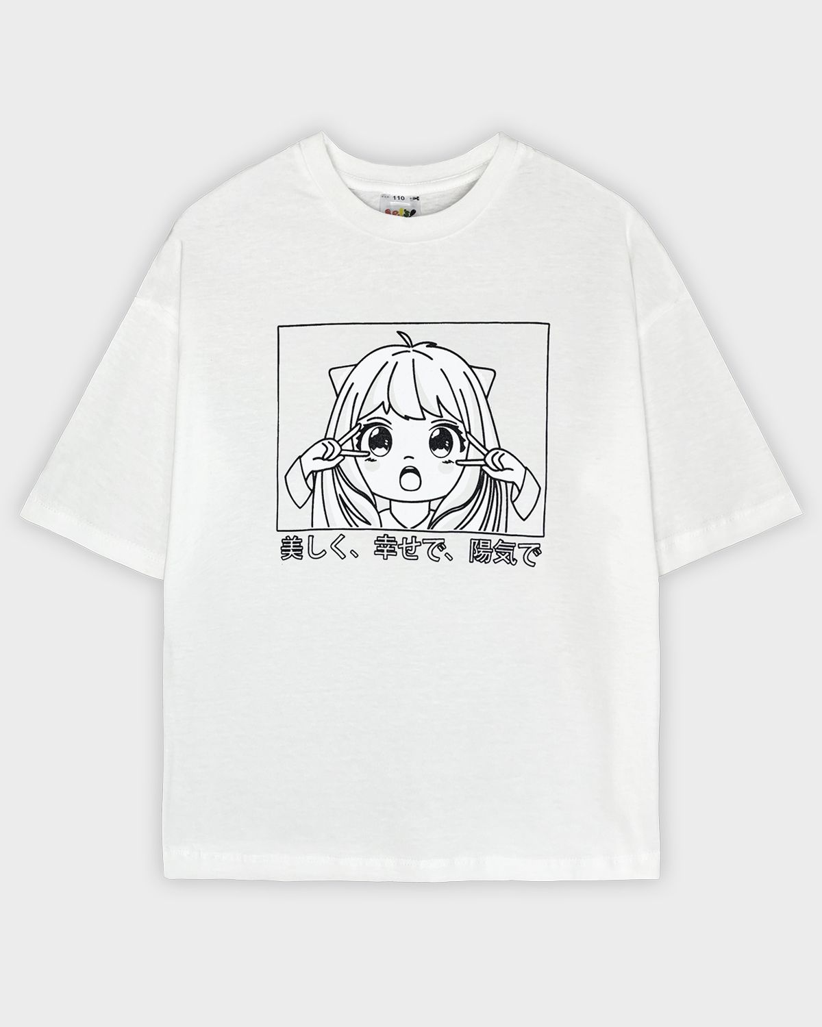 Футболка для девочки свободного силуэта (оверсайз) с коротким рукавом. Горловина круглая, обработана обтачкой из рибаны. Низ изделия и рукава обработаны швом вподгибку. На полочке принт Шелкография. Надпись переводится как "Красивая, счастливая и веселая".