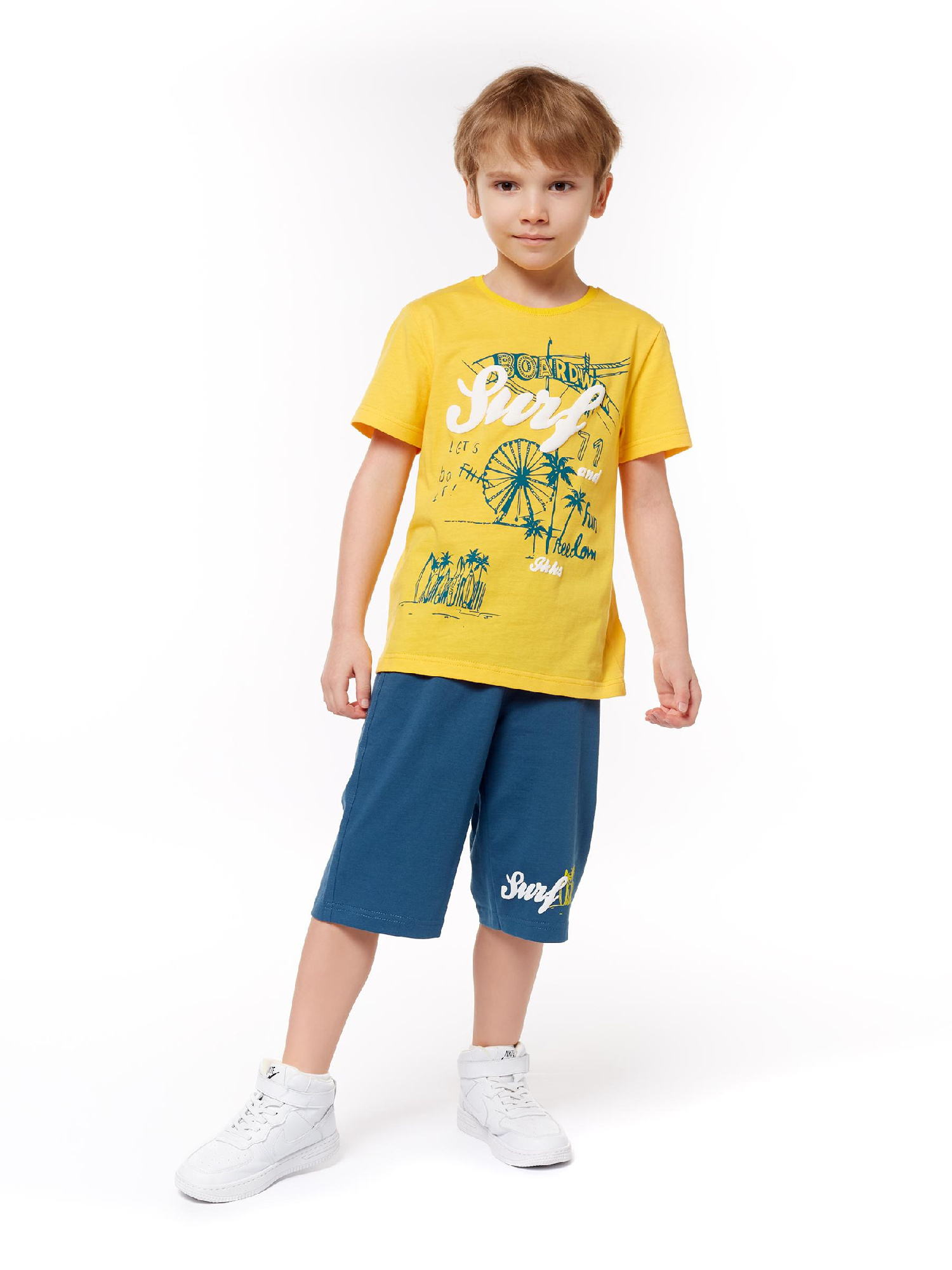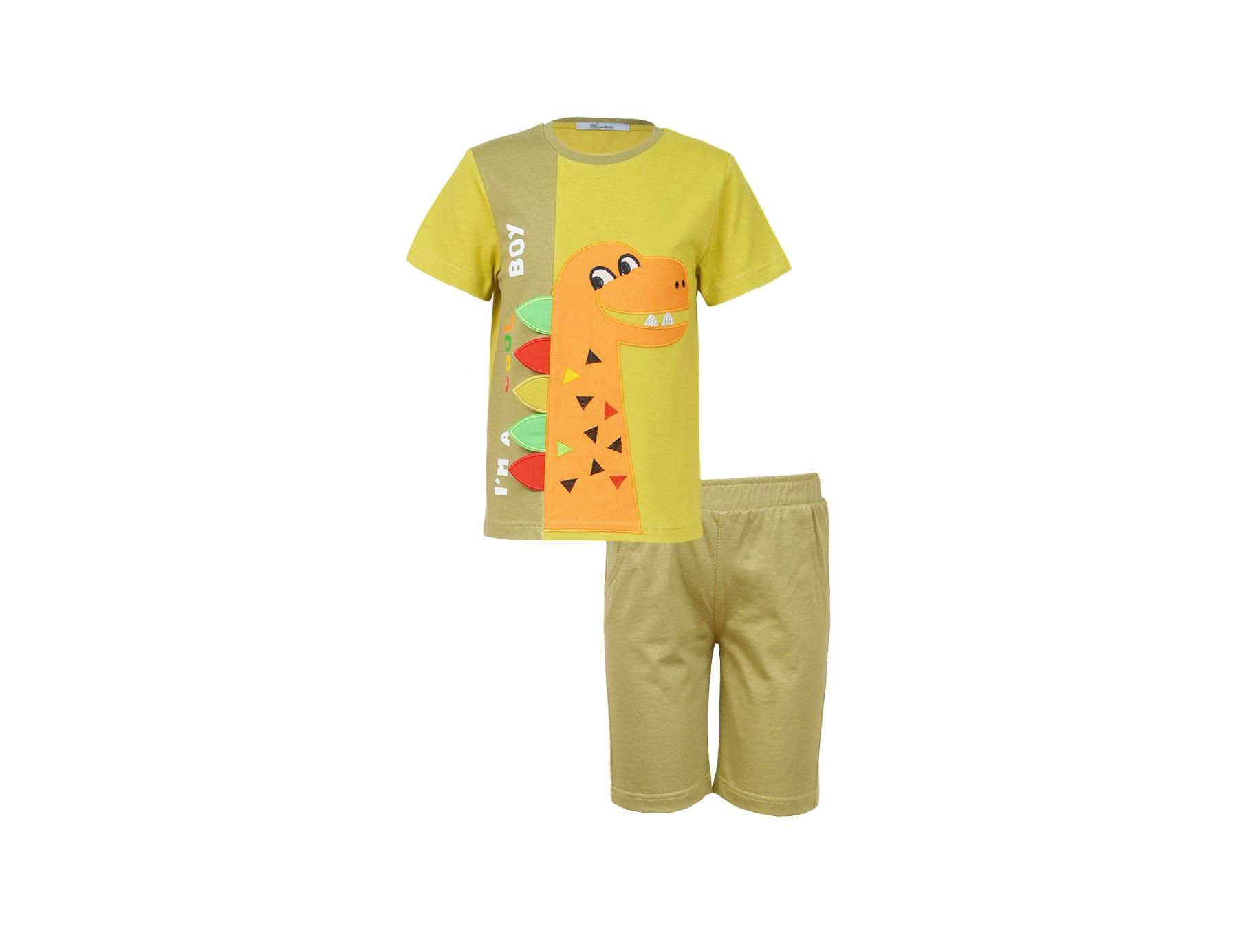 Пижама для мальчика, состоящая из джемпера и брюк. Джемпер прямого силуэта с втачным длинным рукавом. Горловина круглая, окантована рибаной. Плечо с запахом, край запаха обработан рибаной. По низу рукавов манжеты из рибаны. Низ изделия обработан швом вподгибку. На полочке принт ШЕЛКОГРАФИЯ. Брюки прямого кроя из набивного полотна. Пояс цельнокроенный, с эластичной тесьмой внутри. По низу изделия манжеты из рибаны.