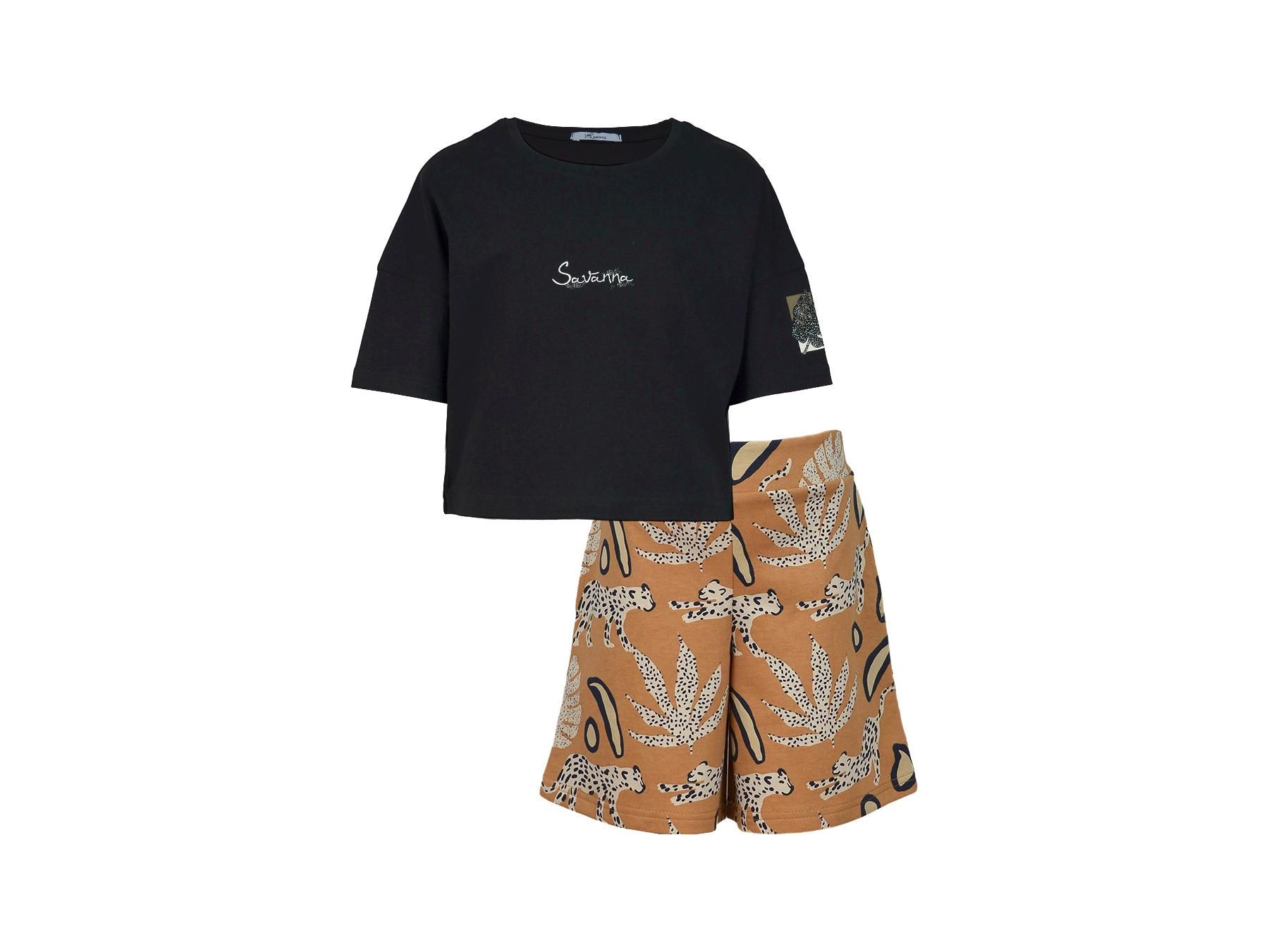 Пижама для девочки, состоящая из футболки и шорт. Футболка прямого силуэта с втачным коротким рукавом. Горловина круглая, обработана воротником из рибаны. По горловине полочки и спинки отделочная строчка. Низ изделия и рукава обработан швом вподгибку. На полочке принт ШЕЛКОГРАФИЯ. Надпись переводится как "Сладкая". Шорты для девочки трапециевидного силуэта из набивного полотна. Пояс цельнокроенный в цвет изделия выполнен из основного полотна с эластичной тесьмой внутри. Низ изделия обработан швом в подгибку.
