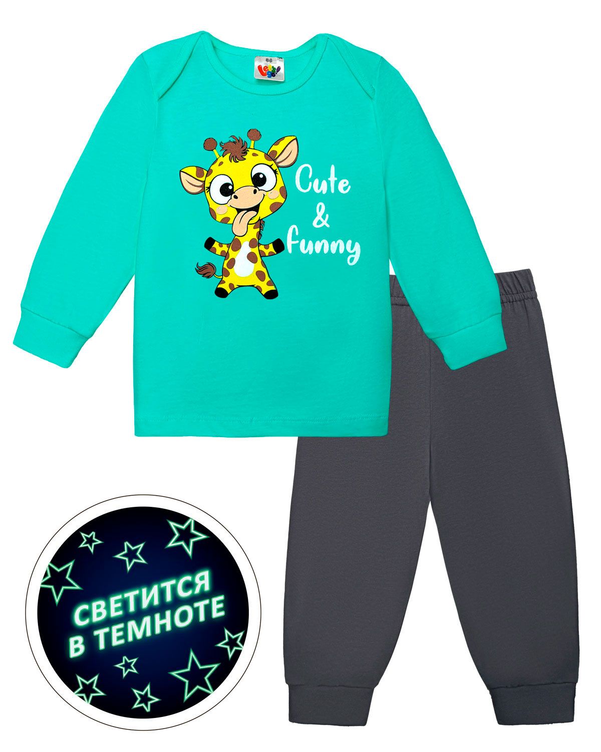 Пижама для девочки, состоящая из джемпера и брюк. Джемпер прямого силуэта, с втачным длинным рукавом. Горловина круглая обработана обтачкой из рибаны. По низу рукавов манжеты из рибаны. Низ изделия обработан швом вподгибку. На полочке принт Шелкография с флуоресцентной краской. ПРИНТ СВЕТИТСЯ В ТЕМНОТЕ. Брюки прямого силуэта, из однотонного полотна. Пояс цельнокроенный, с эластичной тесьмой внутри. По низу изделия манжеты из рибаны.