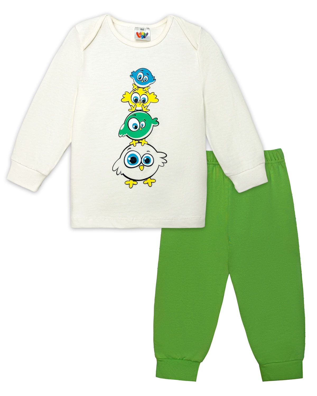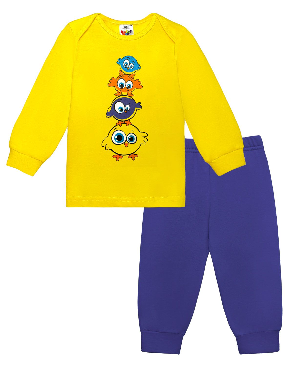 Пижама детская, состоящая из джемпера и брюк. Джемпер прямого силуэта, с втачным длинным рукавом. Горловина круглая, обработана бейкой из рибаны. Спинка, в плечевых швах, переходит на полочку с нахлестом 5см, образуя фигурное закругление к точке основания шеи, по край обработан бейкой из рибаны. По низу рукавов манжеты из рибаны. Низ изделия обработан швом вподгибку. На полочке принт Шелкография. Надпись переводится как "Милый и веселый". Брюки прямого силуэта, из однотонного полотна. Пояс цельнокроенный, с эластичной тесьмой внутри. По низу изделия манжеты из рибаны.