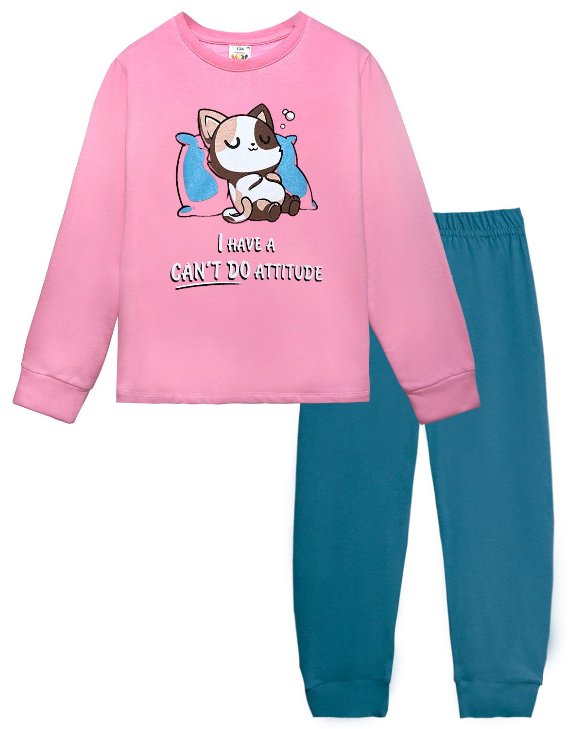 Пижама для девочки, состоящая из джемпера и брюк. Джемпер прямого силуэта, с втачным длинным рукавом. Горловина круглая обработана обтачкой из рибаны. По низу рукавов манжеты из рибаны. Низ изделия обработан швом вподгибку. На полочке принт Шелкография. Надпись переводится как "У меня нерешительный настрой". Брюки прямого силуэта, из однотонного полотна. Пояс цельнокроенный, с эластичной тесьмой внутри. По низу изделия манжеты из рибаны.