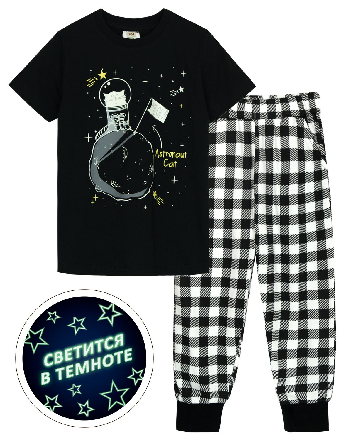 Пижама для мальчика, состоящая из футболки и брюк. Футболка прямого силуэта с втачным коротким рукавом. Горловина круглая, обработана воротником из рибаны. Горловина спинки внутри обработана настрочной планкой из кулирки. Низ изделия и низ рукавов обработан швом в подгибку. На полочке принт, шелкография. Брюки прямого покроя, из набивного полотна. Отрезной пояс, из основного полотна с эластичной тесьмой внутри. На передней половинке брюк карманы с отрезным бочком. По низу изделия манжеты из рибаны. ПРИНТ СВЕТИТСЯ В ТЕМНОТЕ.