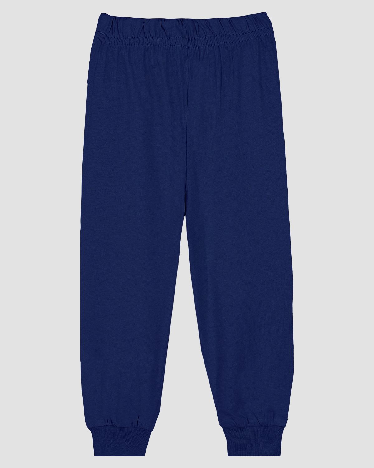 Брюки прямого покроя, из однотонного полотна. Пояс цельнокроеный, с эластичной тесьмой внутри. По низу изделия манжеты из рибаны.