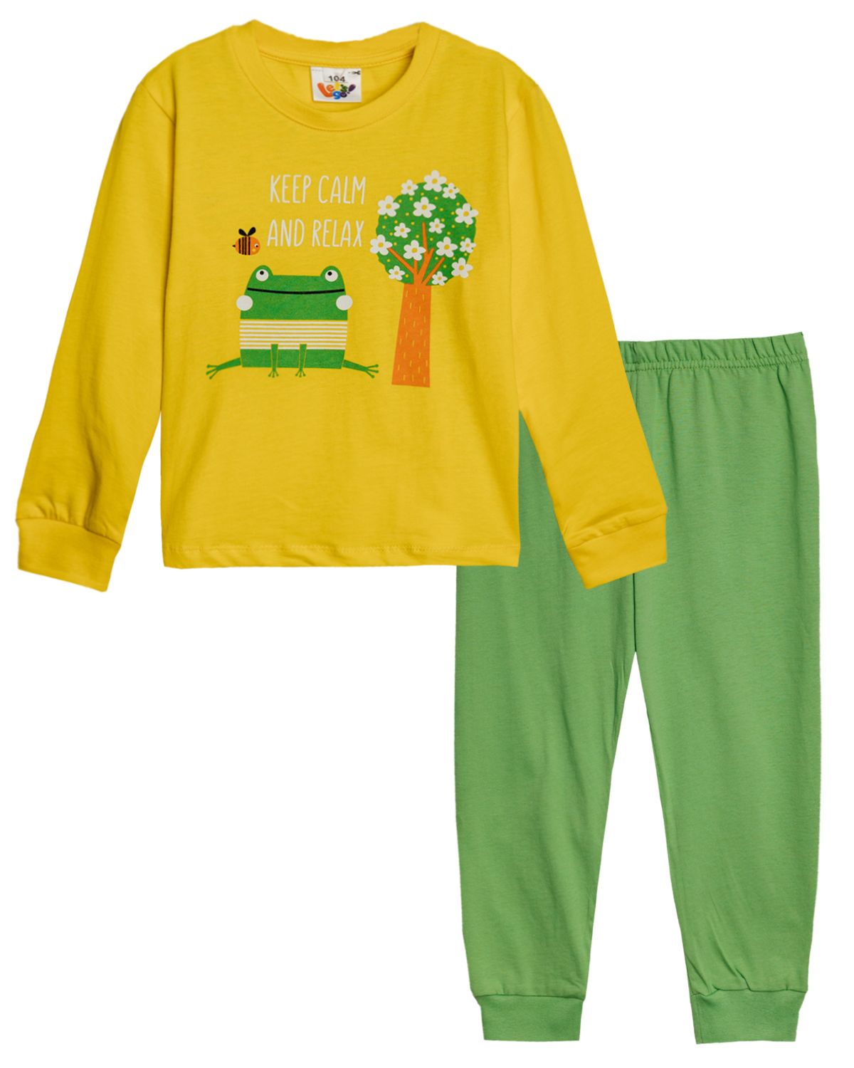 Пижама для девочки, состоящая из джемпера и брюк. Джемпер прямого силуэта, с втачным длинным рукавом. Горловина круглая обработана обтачкой из рибаны. По низу рукавов манжеты из рибаны. Низ изделия обработан швом вподгибку. На полочке принт Шелкография. Надпись переводится как "Сохраняй спокойствие и отдыхай". Брюки прямого силуэта, из однотонного полотна. Пояс цельнокроенный, с эластичной тесьмой внутри. По низу изделия манжеты из рибаны.