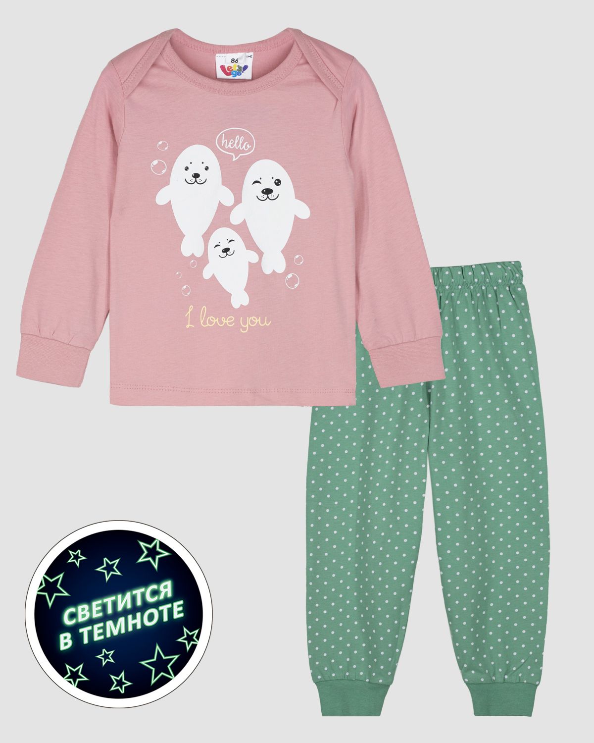 Пижама для девочки, состоящая из джемпера и брюк. Джемпер прямого силуэта с втачным длинным рукавом. Горловина круглая, окантована рибаной. Плечо с запахом, край запаха обработан рибаной. По низу рукавов манжеты из рибаны. Низ изделия обработан швом вподгибку. На полочке принт ШЕЛКОГРАФИЯ С ФЛУОРЕСЦЕНТНОЙ КРАСКОЙ. Надпись переводится как "Привет; Я люблю тебя". Брюки прямого кроя из набивного полотна. Пояс цельнокроенный, с эластичной тесьмой внутри. По низу изделия манжеты из рибаны. ПРИНТ СВЕТИТСЯ В ТЕМНОТЕ.