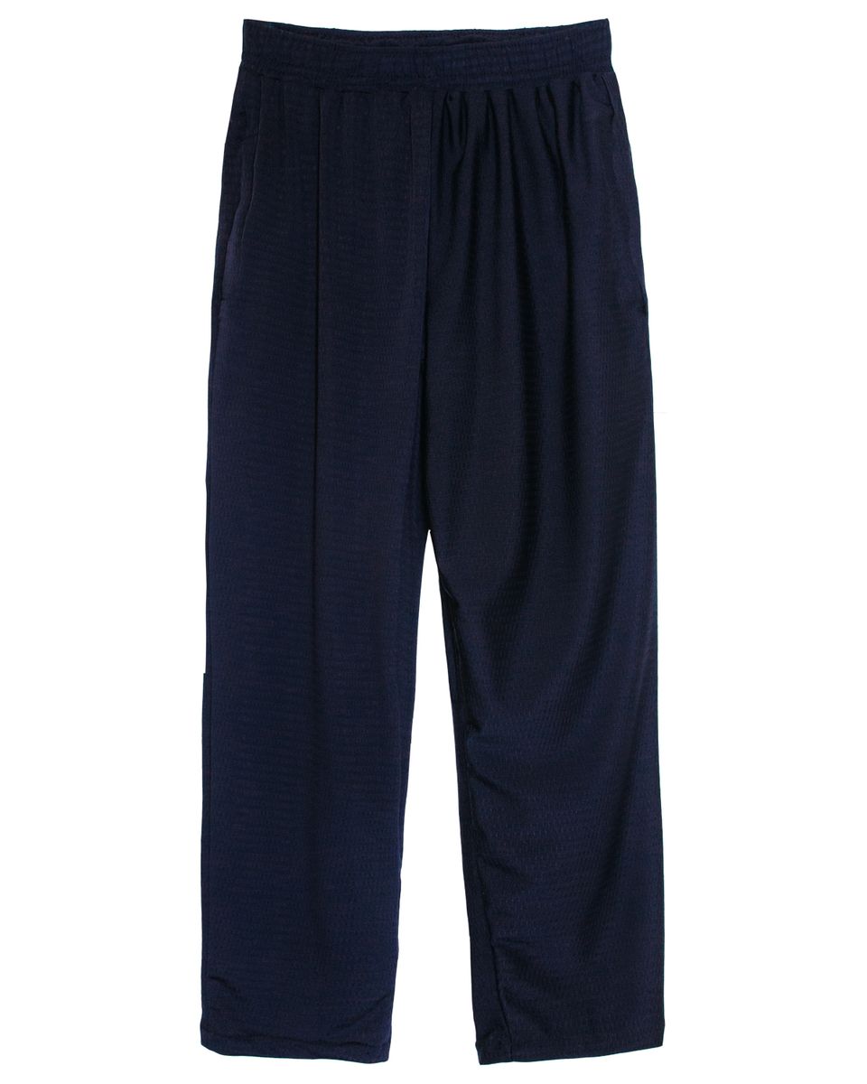 Брюки детские из полотна холодок-сетка прямого силуэта. Пояс отрезной, выполнен из основного полотна, с эластичной тесьмой внутри. Внутри пояса брюк вставлен плоский утягивающий шнурок с пластиковым наконечником. На уровне бедер выполнены карманы с прорезной листочкой, вход в карман с замком. По низу изделия цельнокроенные манжеты на резинки.