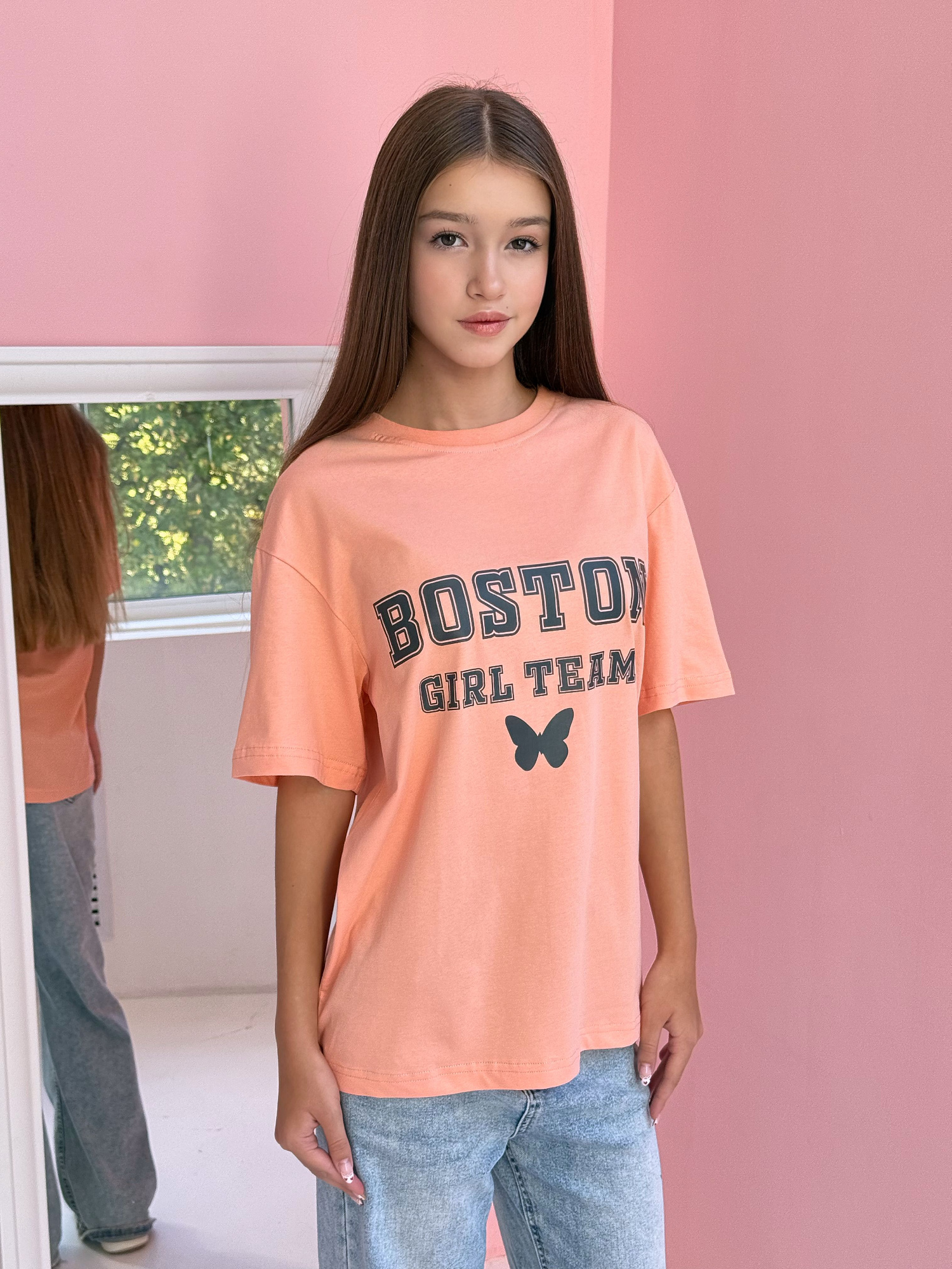 Футболка детская прямого силуэта, крой оверсайз с втачным коротким рукавом. Горловина круглая, обработана воротником из кулирки, в цвет изделия. Горловина спинки внутри обработана настрочной планкой из киперной ленты. Низ рукавов обработан швом вподгибку. На передней полочке принт