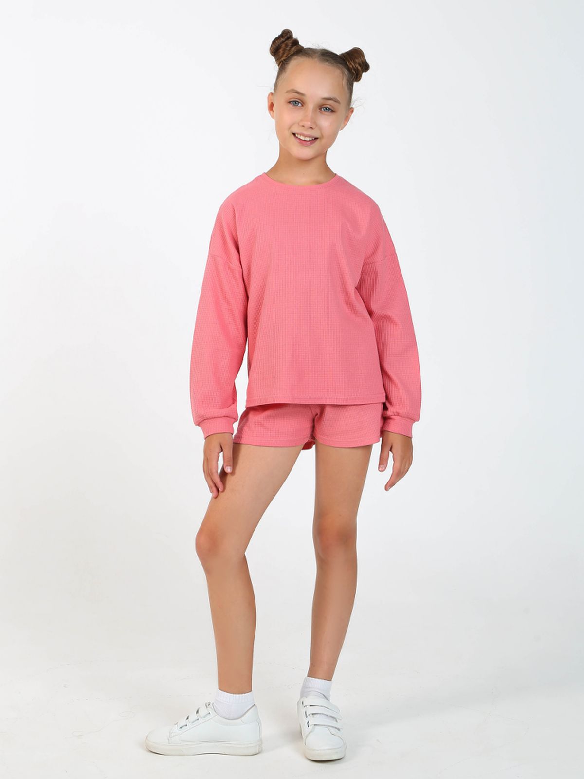 Комплект одежды для девочки бренда "Ивашка" оптом. Костюм из мягкого вафельного трикотажа. Свитшот свободного кроя, круглый вырез горловины, спущенные рукава с манжетами. Свободные шорты с имитацией гульфика.