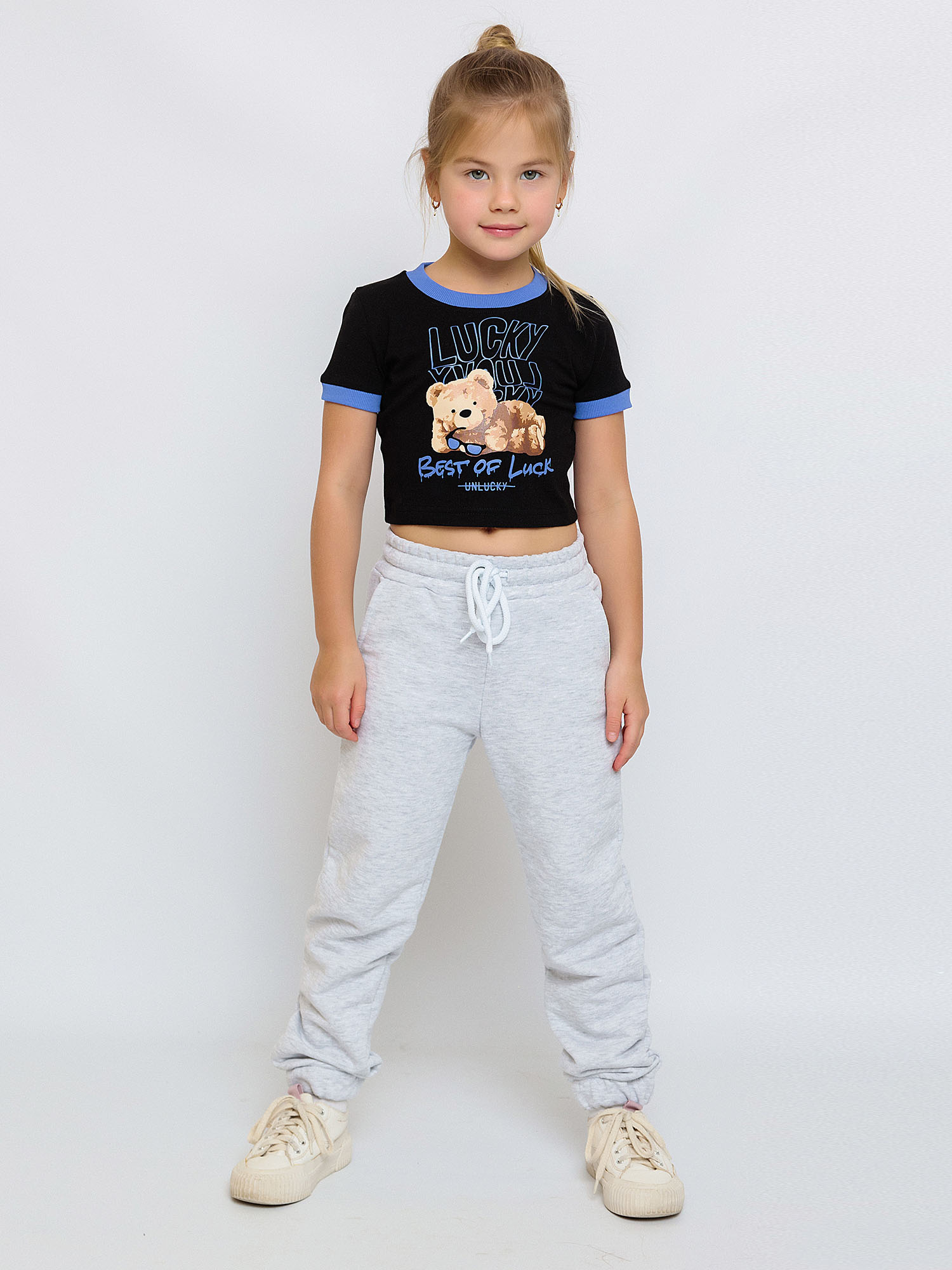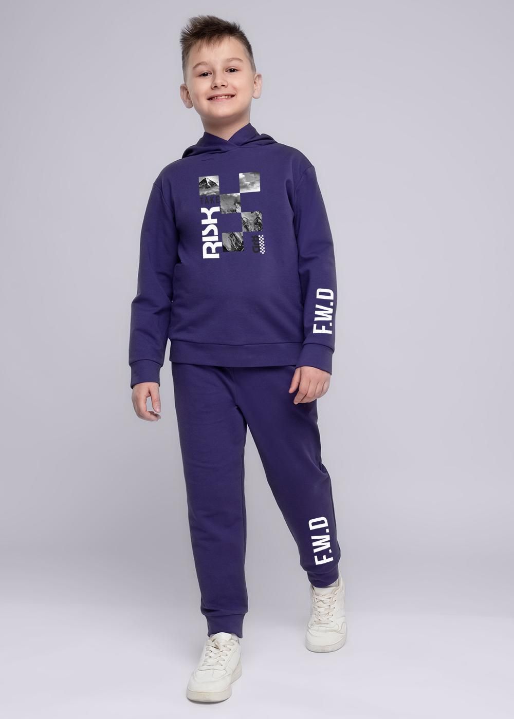 Брюки на манжетах. В поясе резинка и шнур. Карманы в шве. Выполнены из футера с лайкрой, украшены принтом.