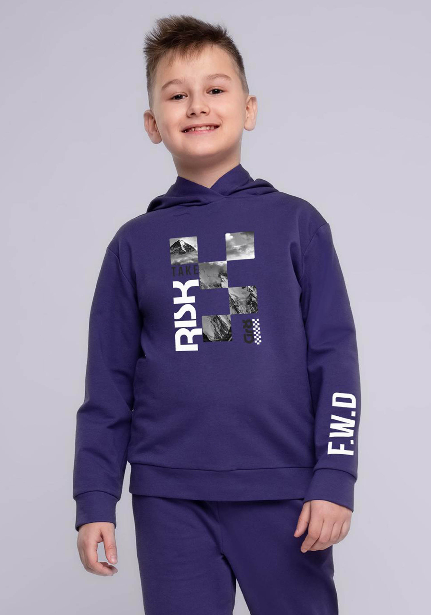 Худи из футера с лайкрой. Удобные манжеты из эластичного кашкорсе. Впереди украшено принтом.