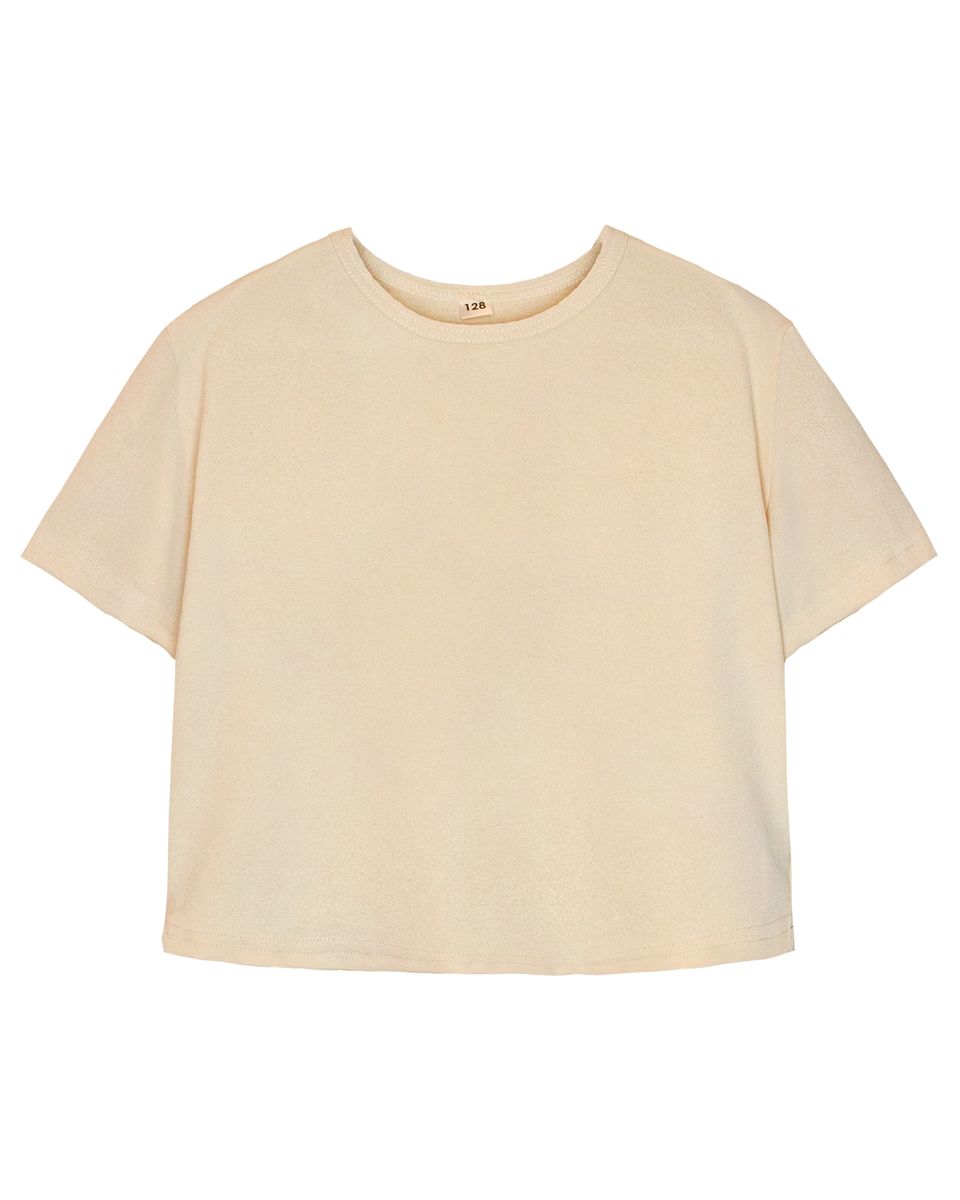 Футболка укороченная для девочки. Свободный прямой крой. Модель с круглым вырезом и окантовкой из основного полотна.