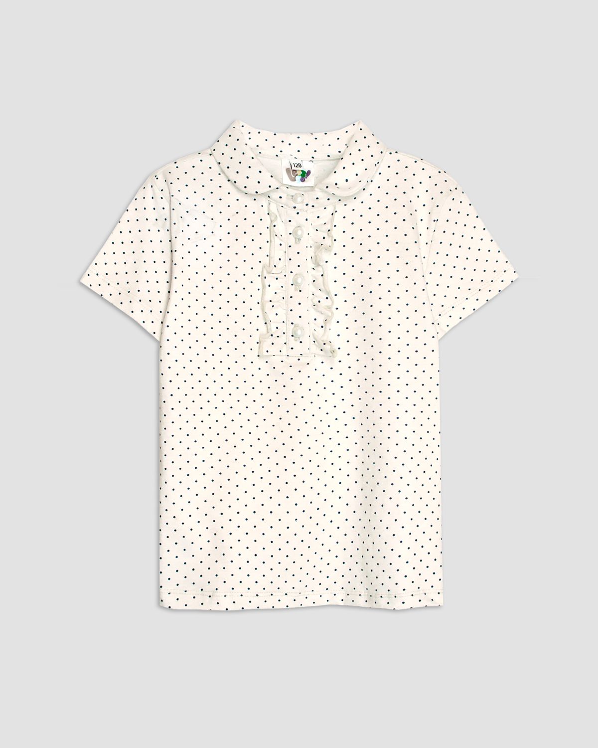 Отличный вариант футболки для маленькой леди, на каждый день и для школы. Горловина круглая обработана классическим воротником со стойкой из основного полотна. На стойке 1 пуговица, на планке 3 пуговицы на ножке в форме полубусин. По краю планки рюша из основного полотна , что добавляет модели элегантности.
