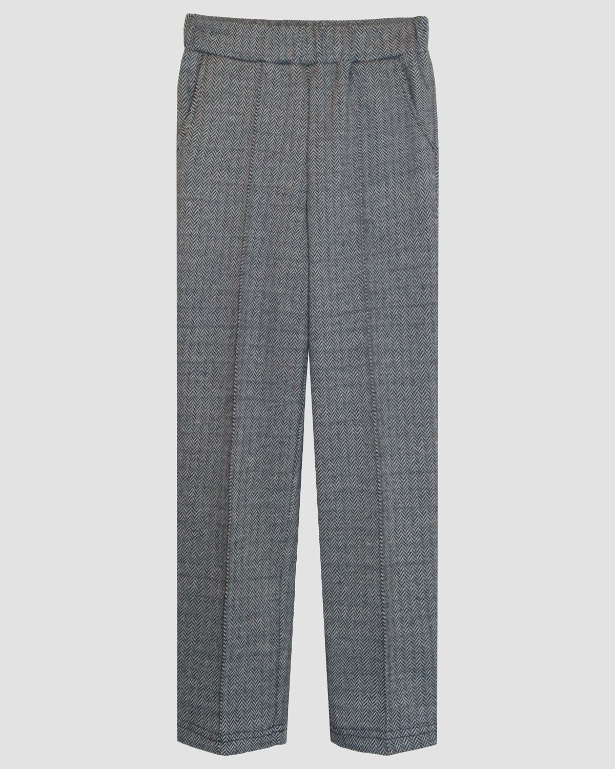 Брюки детские прямого силуэта, пояс отрезной, выполнен из основной ткани, с эластичной тесьмой внутри, тесьма закреплена в шов. На передней половинке брюк кант, который делит переднюю половинку на пополам. Низ изделия обработан швом вподгибку.