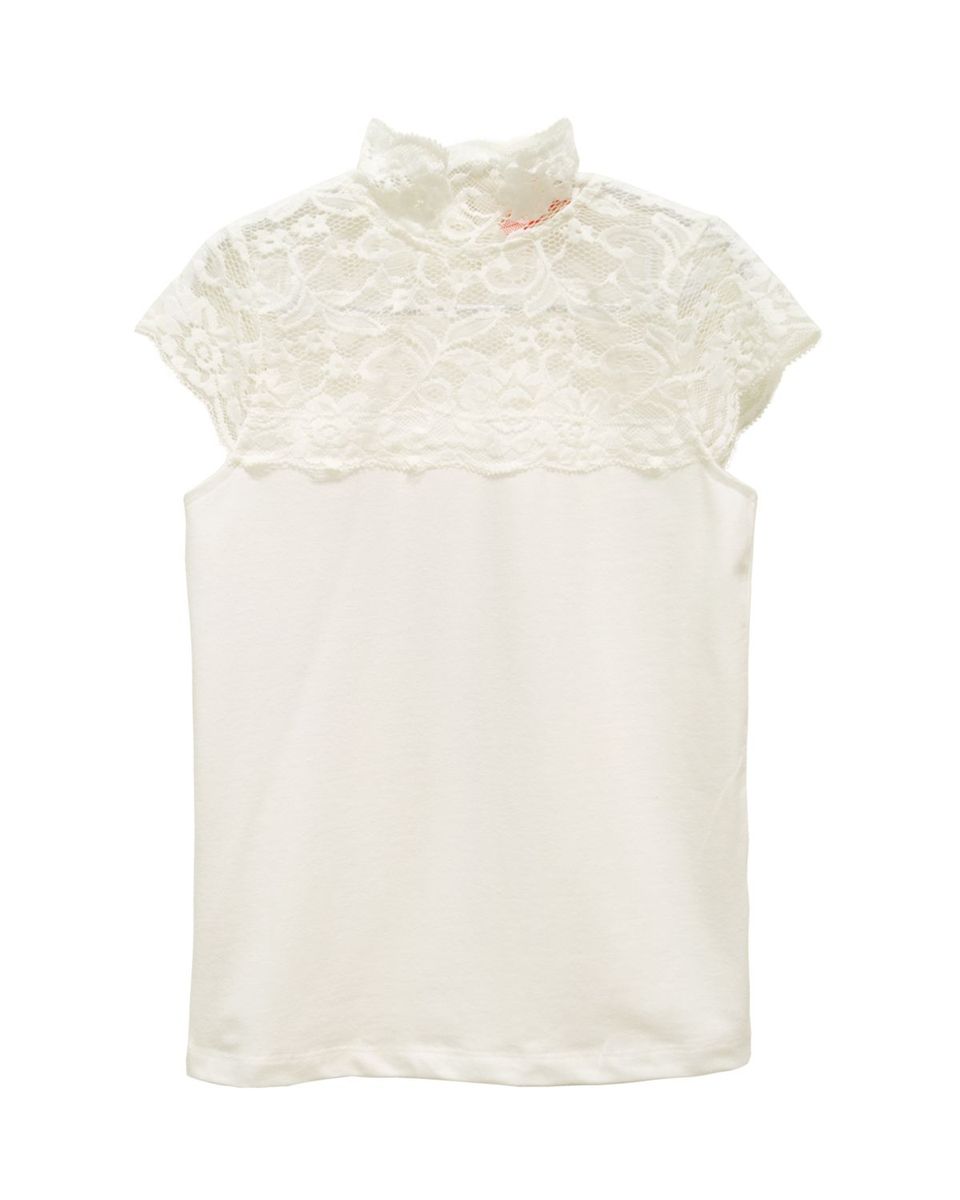 Блузка трикотажная. Кокетка, рукава-крылышки и воротник-стойка выполнены из гипюра с ажурным краем в цвет изделия.