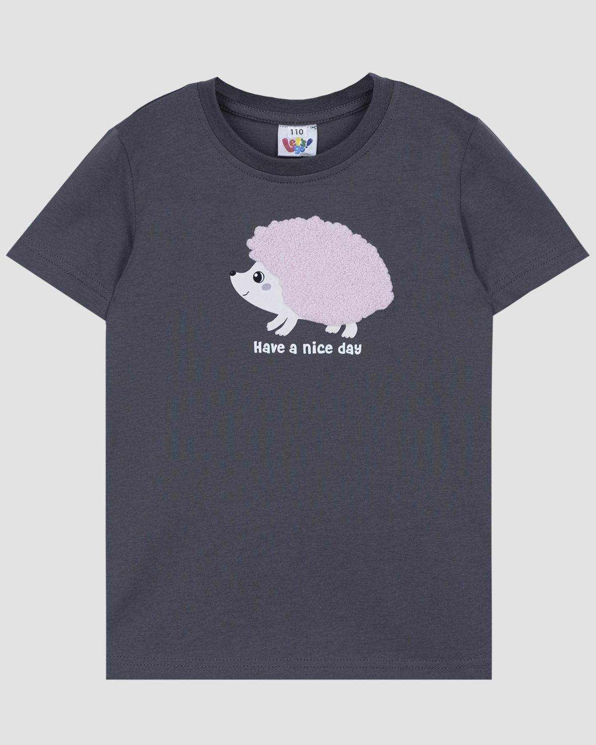 Футболка для девочки прямого силуэта, с втачным коротким рукавом. Горловина круглая, обработана воротником из рибаны 230 г/м². Горловина спинки внутри укреплена бейкой из кулирки. Низ изделия и рукава обработан швом в подгибку. На полочке ПРИНТ ШЕЛКОГРАФИЯ+ВЫШИВКА ШИФОНОВЫМИ ЛЕПЕСТКАМИ. Надпись переводится как "Хорошего дня".
