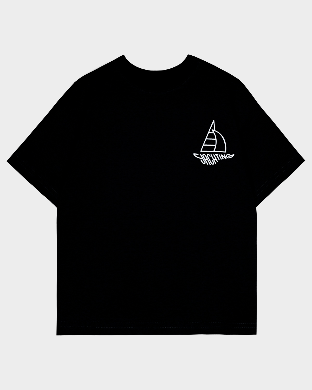 Футболка для мальчика свободного силуэта (оверсайз) с коротким рукавом. Горловина круглая, обработана обтачкой горловиной из рибаны. Низ изделия и рукава обработаны швом вподгибку. На полочке принт Шелкография. Надпись переводится как "Яхтинг".
