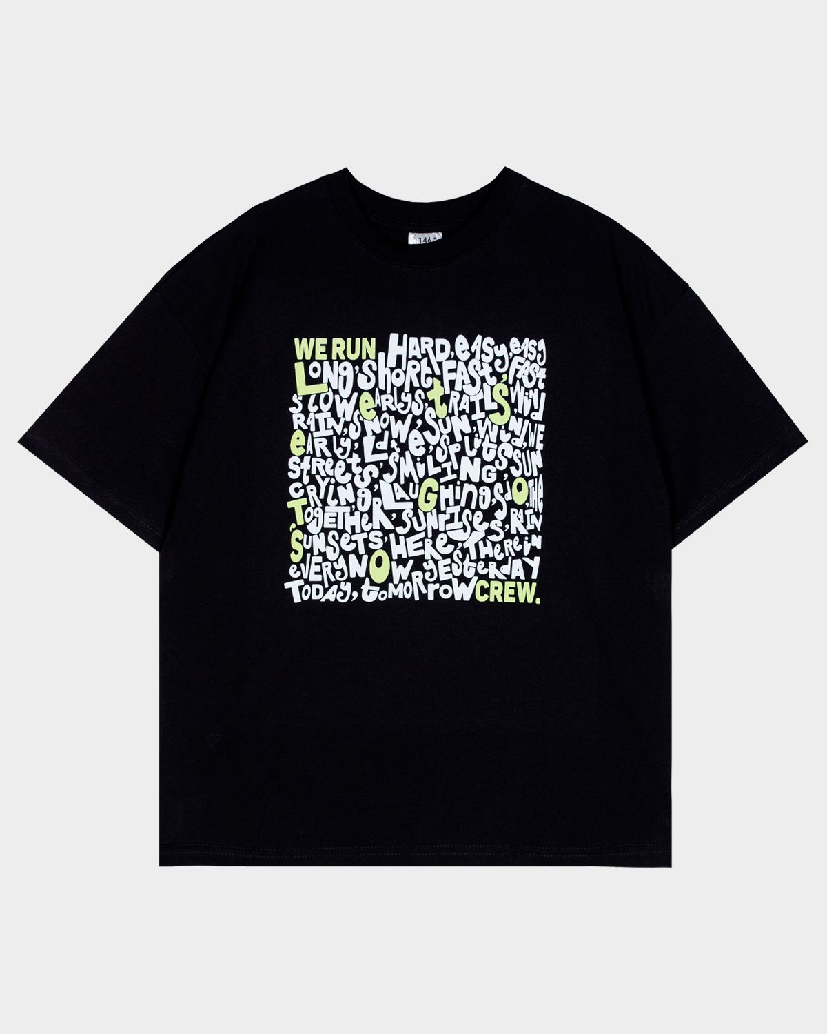 Футболка для мальчика свободного силуэта (оверсайз) с коротким рукавом. Горловина круглая, обработана обтачкой горловиной из рибаны. Низ изделия и рукава обработаны швом вподгибку. На полочке принт Шелкография. Надпись переводится как "Мы бежим, команда;Вперед;Тяжело,легко,долго,коротко,быстро,медленно,арии,тропы,ветер,дождь,сейча,солнце,мы,рано,последний,расколы,улицы,улыбайся,плача,смеясь,в одиночку,вместе,рассветы,закаты,здесь,там,в,каждый,вчера,сегодня,завтра".