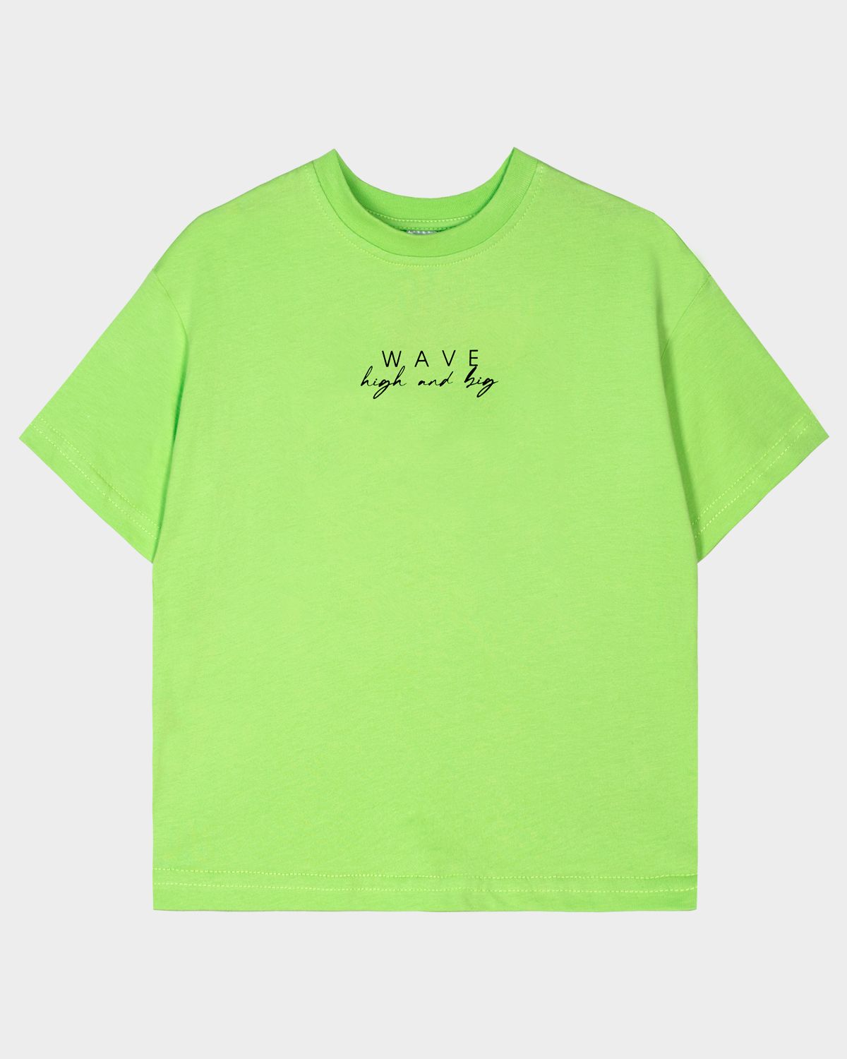 Футболка для мальчика свободного силуэта (оверсайз) с коротким рукавом. Горловина круглая, обработана обтачкой горловиной из рибаны. Низ изделия и рукава обработаны швом вподгибку. На полочке принт Шелкография. Надпись переводится как "Волна высокая и большая".